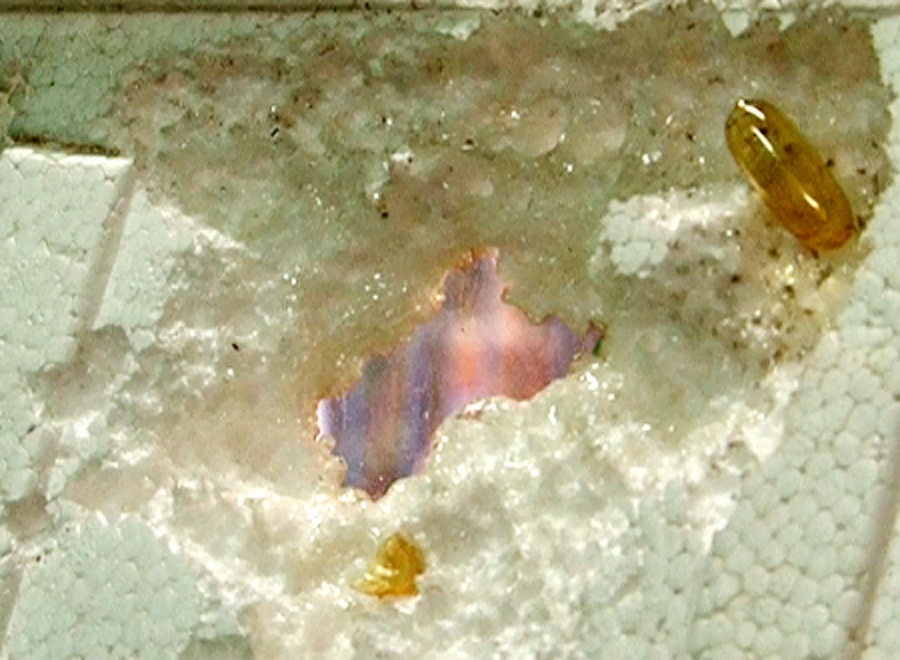 | Viên omega-3 Trung Quốc gây thủng miếng xốp trong 10 phút. Ảnh: Minh Hoàng. |