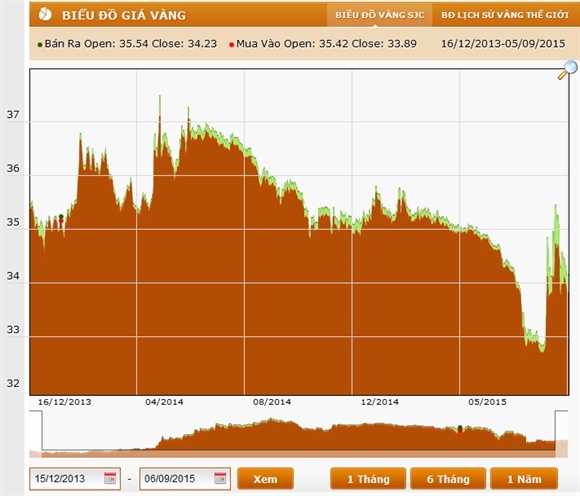 Kể từ lúc đạt mức cao kỉ lục vào tháng 4/2014 cho đến nay, thị trường vàng đang có xu hướng giảm dần và đạt mức thấp nhất vào ngày 8/8/2015, do những biến động của sàn vàng thế giới. Trong những ngày gần đây nhất, thị trường vàng đang có xu hướng đi xuống. Dường như thị trường đang chờ đợi những tín hiệu rõ ràng hơn về vàng thế giới hay thông tin FED tăng lãi suất.