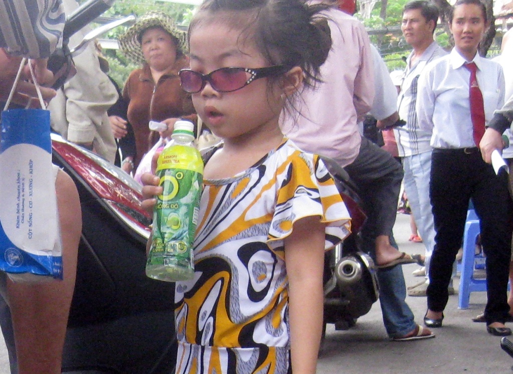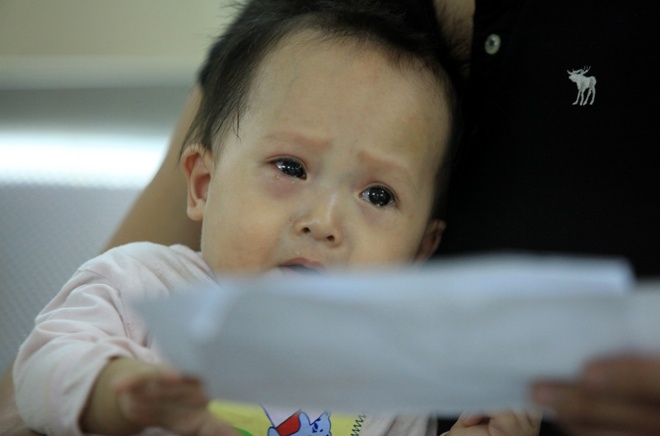 Bé Nguyễn Khánh Ngọc (1 tuổi) từ Phú Thứ, Tây Mỗ, huyện Từ Liêm cách trung tâm thủ đô hơn chục cây số được mẹ đưa đến viện mắt từ sớm ngồi chờ đợi. Mẹ bé cho biết mấy hôm trước mắt bé đỏ ngầu, tự điều trị không ăn thua mặc dù đã đỡ hơn.