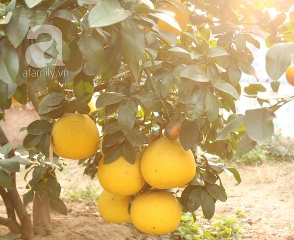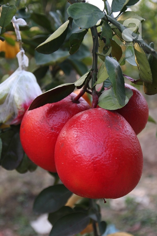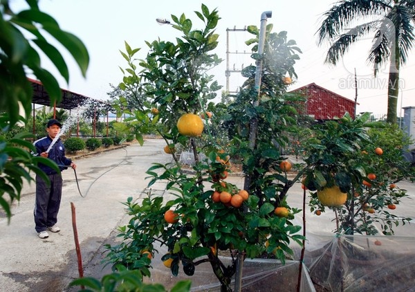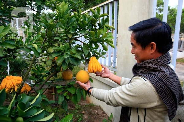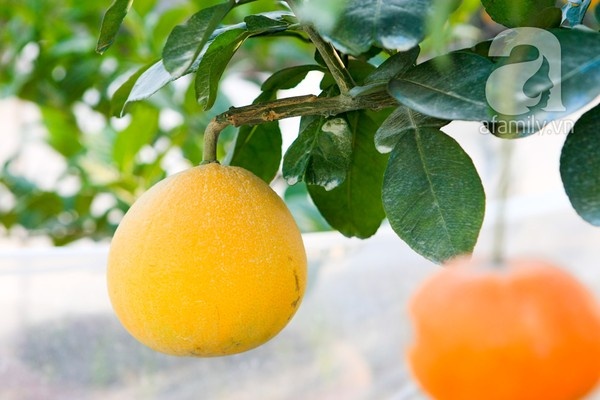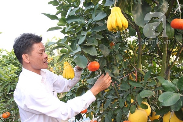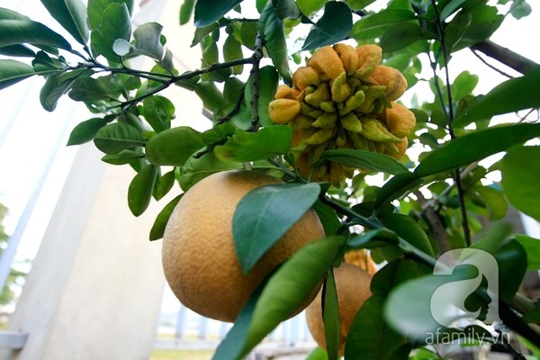 Năm nay, anh tạo điểm nhấn cho cây ngũ quả của mình bằng những chùm bưởi thơm (giống từ Thái Lan) sai lúc lỉu, những quả phật thủ sinh đôi rất hiếm mà anh phải đặt riêng ở làng Đắc Sở và những quả bưởi “mặt trời” đỏ rực.