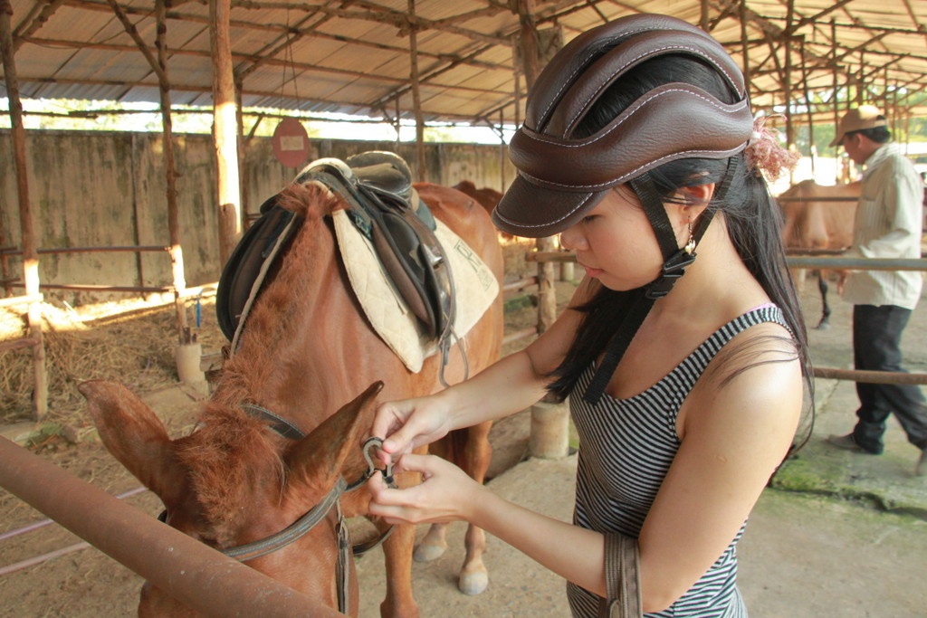 | Mỗi học viên tự vào chuồng chọn cho mình một con ngựa ưng ý rồi tự đóng yên cương. Hình ảnh Yến Ngọc (25 tuổi) chọn chú ngựa mà cô đã tập quen thuộc trước đó. Trong chuồng có 20 con ngựa. |