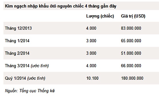 Tín hiệu ấm lên cũng thể hiện rõ ở đà tăng tốc theo từng tháng. Báo cáo của Tổng cục Thống kê cũng cho biết, kim ngạch nhập khẩu ôtô nguyên chiếc tháng 3/2014 ước đạt 4.000 xe và 66 triệu USD, tăng 1.000 xe về lượng và 15 triệu USD về giá trị so với tháng liền trước.
