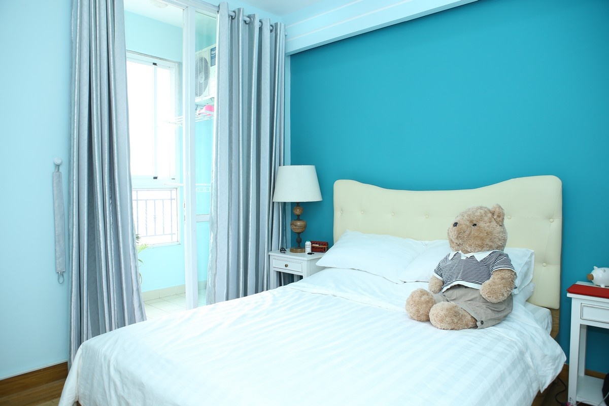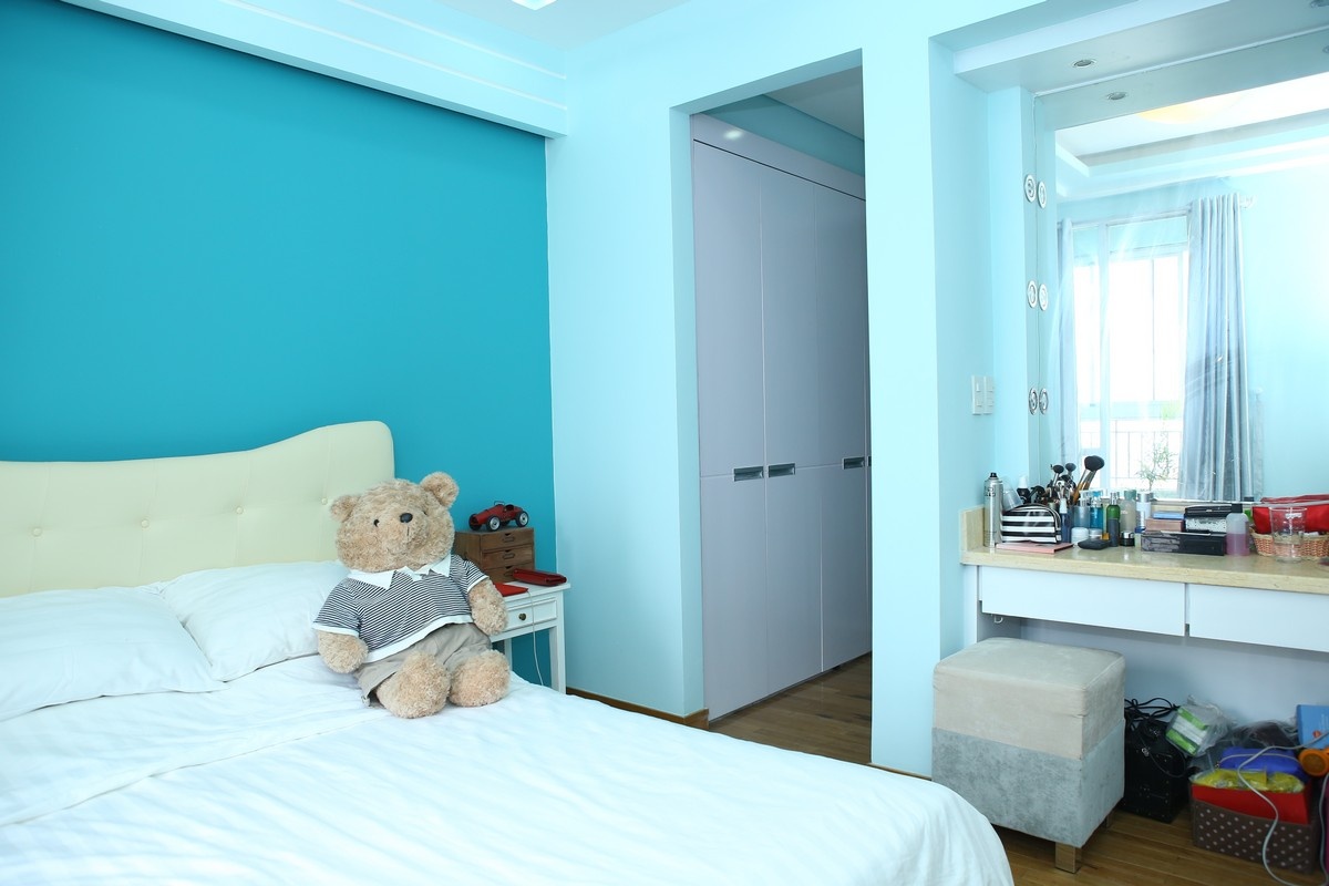 | Phòng ngủ của Trúc Diễm cũng được quét sơn màu trắng xanh dịu mát. Gam màu này đem lại cảm giác thanh bình nên rất được nữ chủ nhân yêu thích. |
