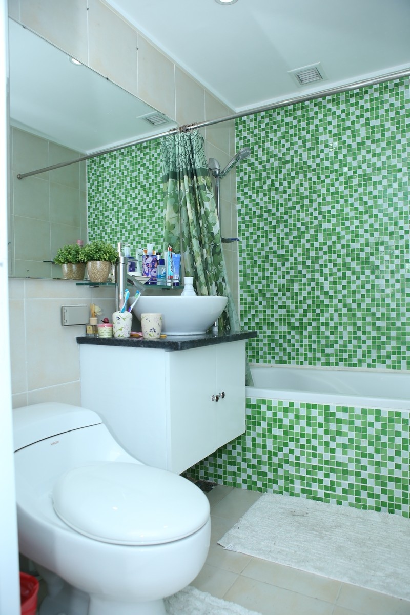 Nhà vệ sinh cũng có gam màu xanh rêu nhạt đồng bộ với gam màu chung.
