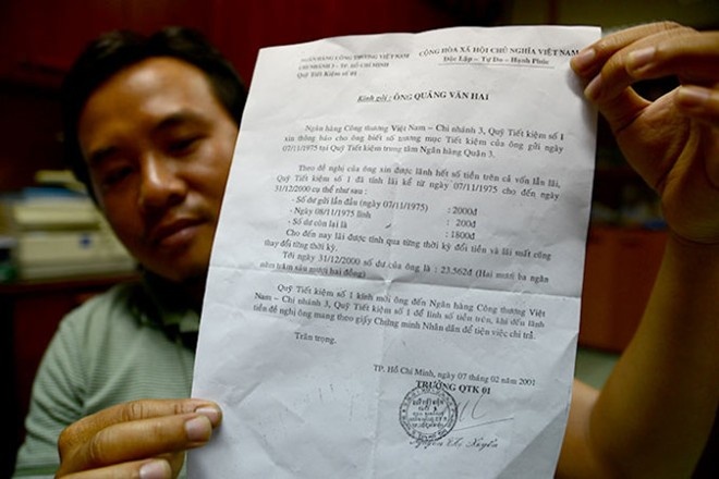 Anh Minh cho hay, năm 2001, sau khi “gõ cửa” nhiều nơi, gia đình ông được hướng dẫn đến NH Công thương VN (VietinBank) chi nhánh 3, TP HCM sẽ là đơn vị chi trả cho khoản tiết kiệm có số dư gửi là 1.800 đồng vào ngày 8/11/1975 do ba anh Minh đứng tên.