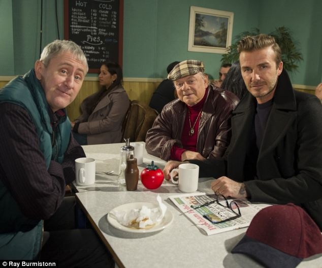 | Beckham gặp hai diễn viên hài Sir David Jason và Nicholas Lyndhurst để trao đổi về bộ phim. Ảnh: BBC. |