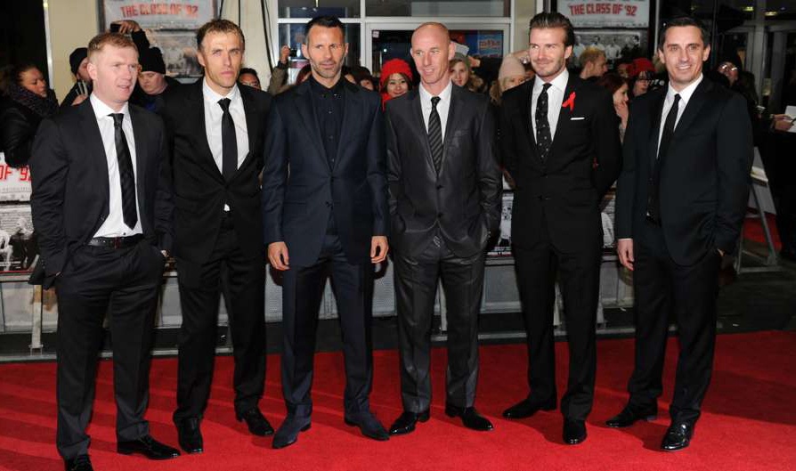 | Becks và các đồng đội cũ: anh em nhà Neville, Scholes, Giggs, Butt gặp mặt trong buổi ra mắt bộ phim tài liệu: "Thế hệ vàng 1992". |