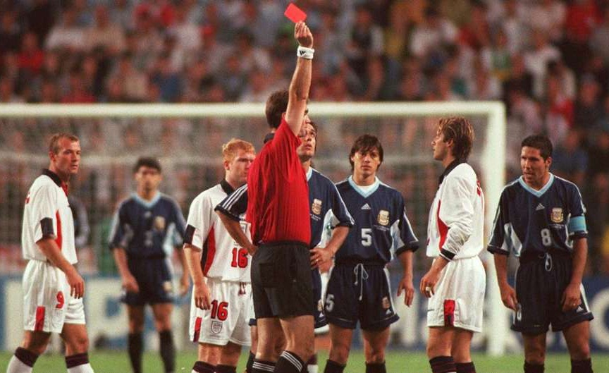 | Nhưng cũng trên đất Pháp, Beckham nhận thẻ đỏ không đáng có ở vòng 1/8, góp phần khiến tuyển Anh bị Argentina loại trên chấm phạt đền. |