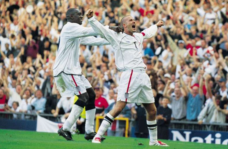 | Ngày 6/10/2001, cú sút phạt tuyệt đẹp của Becks giúp tuyển Anh đánh bại Hy Lạp 2-1 tại Old Trafford, qua đó giành vé dự World Cup 2002 vào phút chót. |