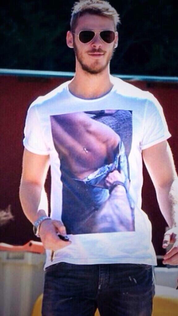 Tuy nhiên, người hâm mộ khá bất ngờ với chiếc áo phông có hình vẽ phản cảm mà de Gea đang mặc. Chiếc áo in hình bàn tay một người đàn ông đang kéo quần jean của một người phụ nữ nóng bỏng đậm chất gợi dục.