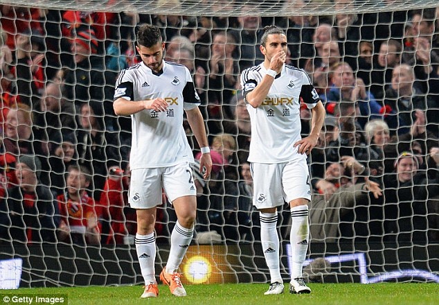 | Nỗi thất vọng của cầu thủ Swansea sau khi chịu cảnh trắng tay tại Old Trafford. |