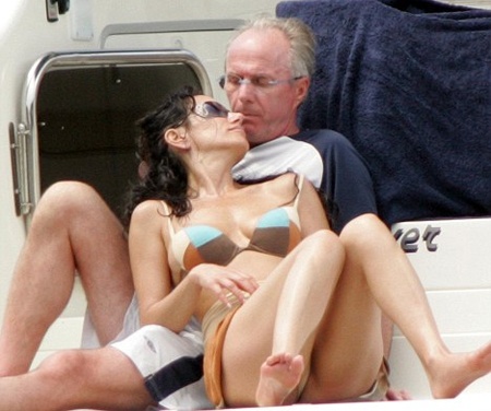 | HLV Eriksson thân mật bên người tình Nancy Dell'Olio. Ảnh: The Sun. |