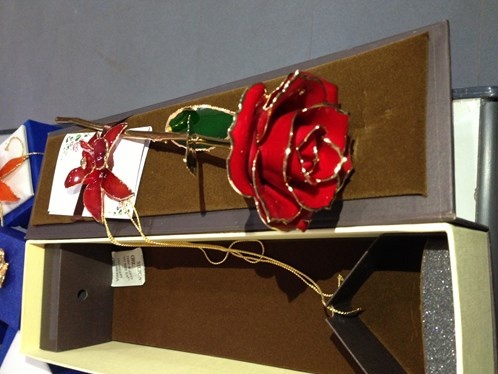 | Một sản phẩm cũng đang được chuộng là loại hoa hồng đỏ viền dát vàng. |