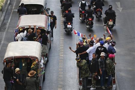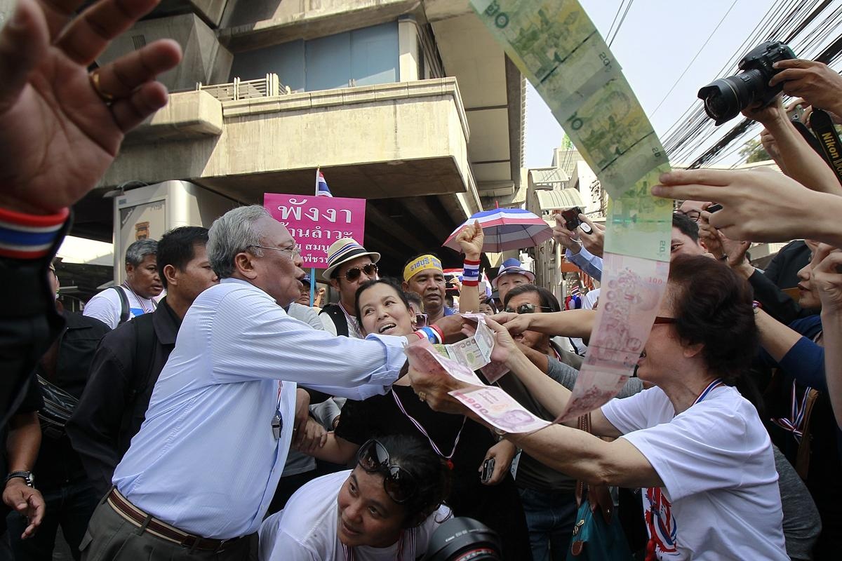| Cựu phó thủ tướng Suthep Thaugsuban, người lãnh đạo chiến dịch lật đổ chính phủ, nhận tiền của những người biểu tình ở trung tâm Bangkok. Ảnh: Reuters |
