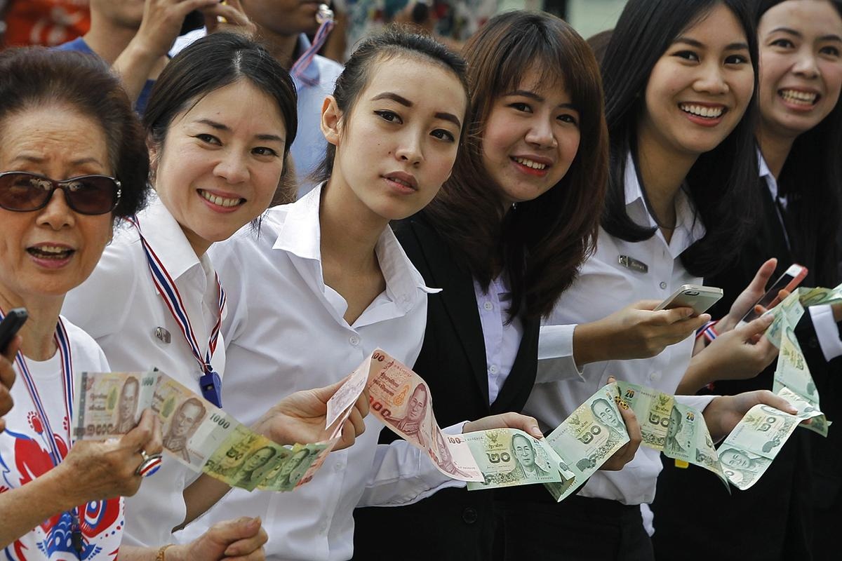 | Những người biểu tình nối những tờ bath thành dây trong lúc họ tuần hành ở trung thâm thành phố Bangkok hôm 3/2. Đây là những tờ giấy bạc mà họ muốn quyên góp cho chiến dịch lật đổ chính phủ. Ảnh: Reuters |