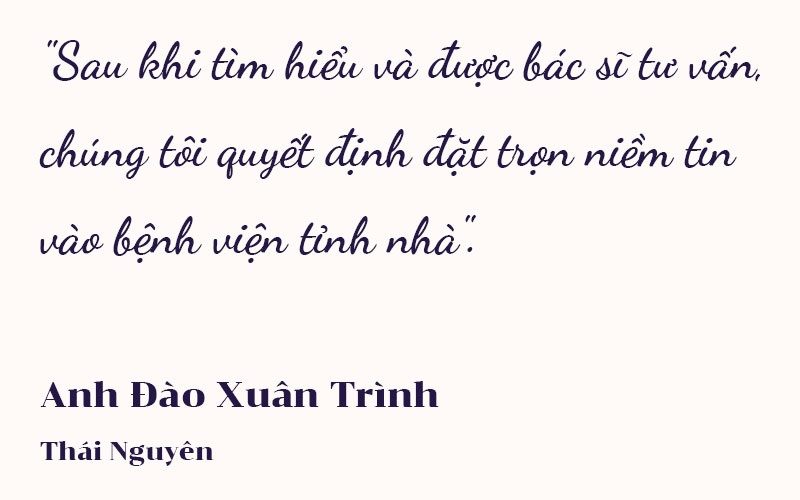 Lâu nay, mỗi khi phải đi khám chữa bệnh, nhiều người thường chọn đến thẳng các bệnh viện tuyến trung ương. Xét cho cùng, tâm lý vượt tuyến đến từ câu chuyện niềm tin vào trình độ của các bác sĩ tuyến dưới. Tuy nhiên, vợ chồng anh Đào Xuân Trình (29 tuổi, Thái Nguyên) lại nghĩ khác.