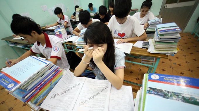 | Học sinh trường THPT Nhân Việt ( quận Tân Phú, TP.HCM) ôn thi tốt nghiệp năm 2013 với quá nhiều sách vở. |