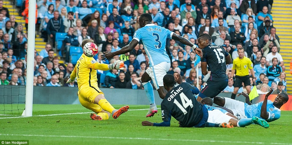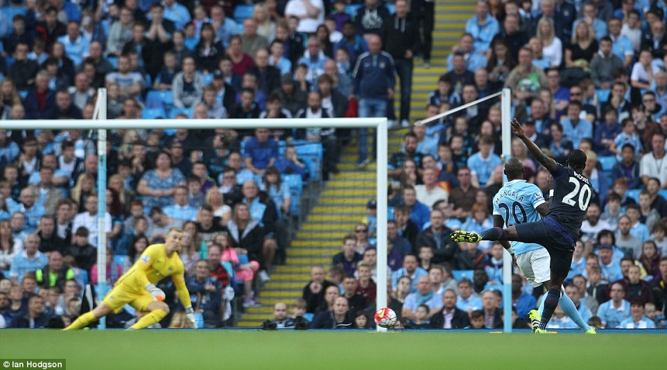| Một tân binh khác của Man City là trung vệ Nicolas Otamendi có cú đánh đầu nguy hiểm khi lên tham gia tấn công. |