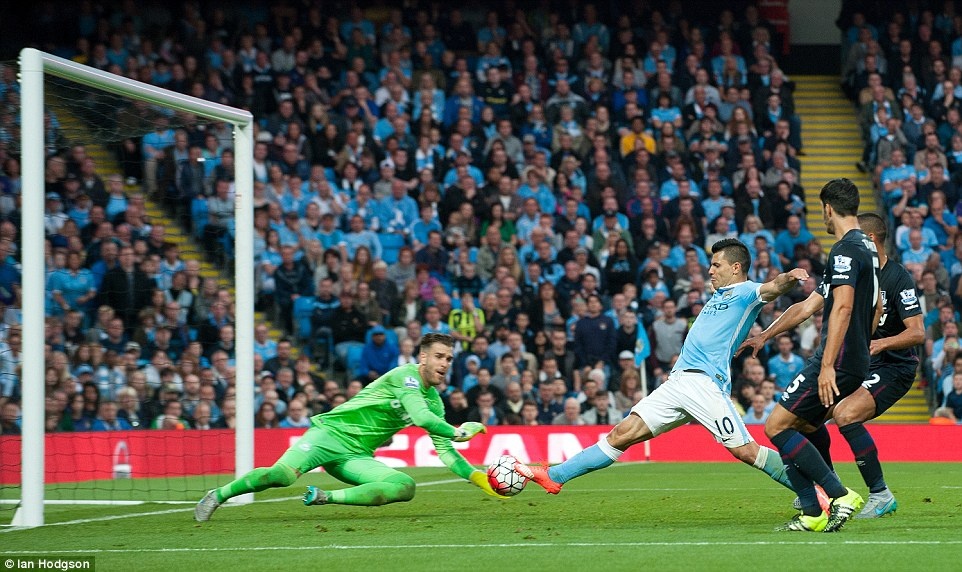 | Tiền đạo Sergio Aguero có cơ hội, nhưng anh không thể đánh bại thủ môn Adrian để ghi bàn cho Man City. Sau 90 phút, Man xanh thua chung cuộc với tỷ số 1-2 ở vòng 6 Premier League. |