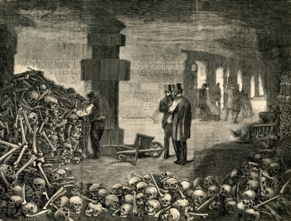 Hệ thống đường hầm này được tạo thành từ các hoạt động khai thác đá vôi để xây dựng Paris từ nhiều thế kỷ trước. Tuy nhiên, khi bệnh dịch hoành hành vào năm 1786 những nghĩa địa trên khắp Thủ đô Paris chật cứng, không thể đáp ứng điều kiện chôn cất hợp vệ sinh, người ta nảy ra sáng kiến đưa các bộ hài cốt vào hệ thống đường hầm ngầm dưới lòng đất hoặc mỏ đá cũ.