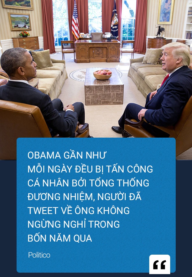 Tổng thống da màu đầu tiên của Mỹ cùng lúc phải đối mặt với cả hai tình huống, trong những điều kiện chưa từng có: Ông Obama gần như mỗi ngày đều bị tấn công cá nhân bởi tổng thống đương nhiệm, người đã tweet về ông không ngừng nghỉ trong bốn năm qua, thường xuyên cáo buộc ông và các quan chức hàng đầu của ông một loạt tội lỗi, tình huống mà không một cựu tổng thống nào phải đối mặt hoặc thậm chí là tưởng tượng.
