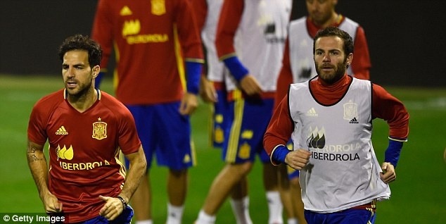 Hai tiền vệ hàng đầu hiện chơi bóng ở Premier League, Cesc Fabregas (trái, Chelsea) và Juan Mata (phải, MU) tập luyện khá tính cực.