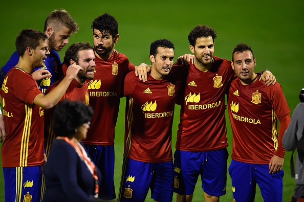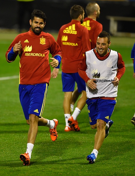 Không khí trong buổi tập của đội tuyển Tây Ban Nha khá vui vẻ. Tiền đạo Diego Costa (trái) không đá trận cuối vòng loại EURO 2016 do dính chấn thương. Tuy nhiên, anh nhiều khả năng góp mặt trong đội hình xuất phát ở trận gặp ĐT Anh.