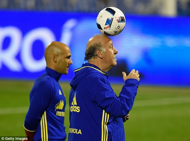 Huấn luyện viên Del Bosque biểu diễn kỹ thuật dùng đầu khống chế bóng trên sân tập của đội tuyển Tây Ban Nha.