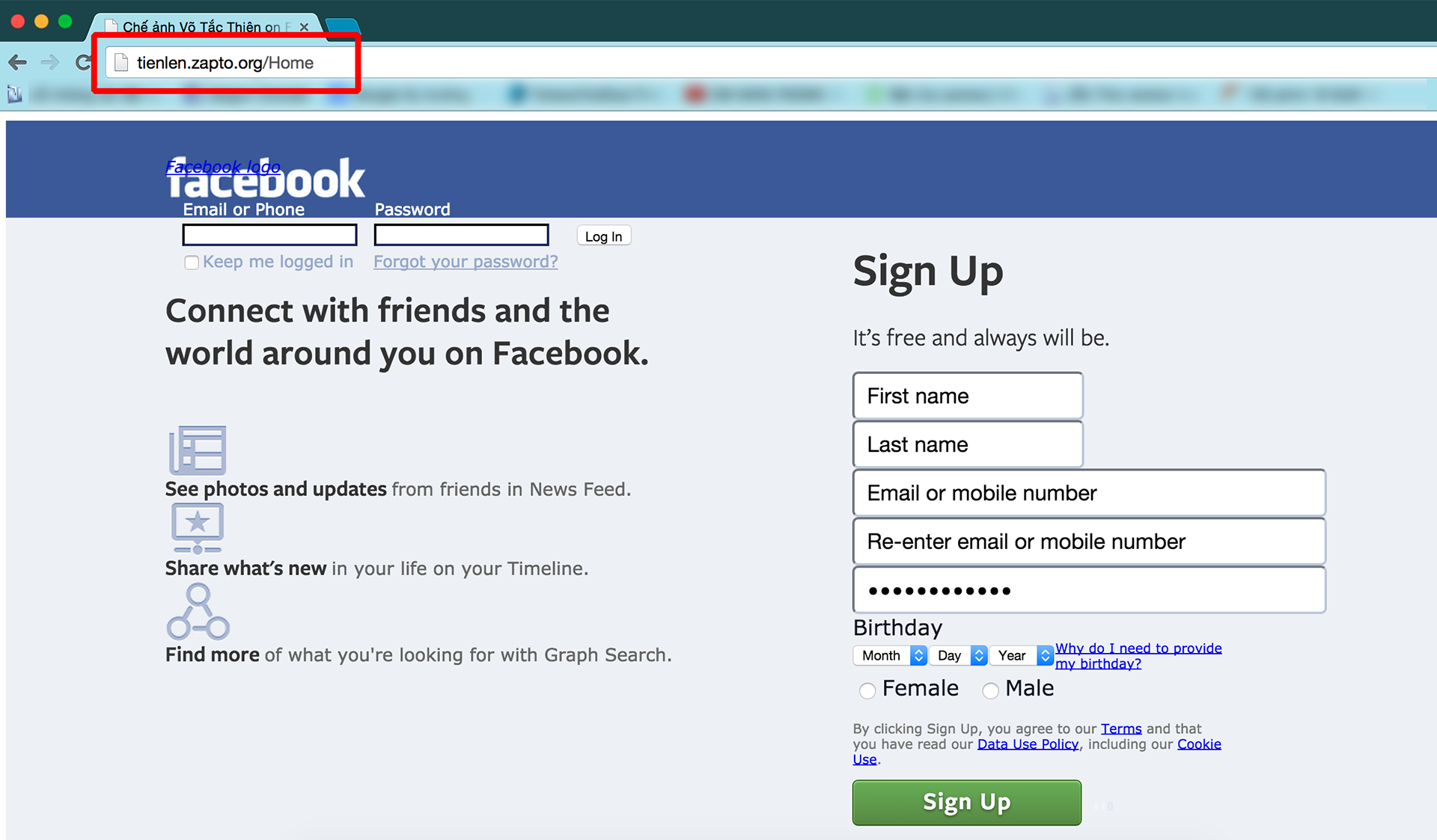 Khác với ứng dụng chế ảnh trên di động, ứng dụng trên Facebook không có tính năng "tô son điểm phấn", mà chỉ dẫn dụ người dùng đăng nhập vào một website giả mạo có giao diện giống Facebook để chiếm đoạt tài khoản người dùng. "Mình thấy một người bạn mời sử dụng 'chế ảnh Võ Tắc Thiên', click vào thì thấy Facebook bắt đăng nhập lại, nhưng trên thanh địa chỉ trình duyệt là "tienlen.zapto.org" chứ không phải là địa chỉ của Facebook", Nguyễn Hà Phương, một người dùng Facebook tại TP HCM cho biết. Theo Phương, khi đăng nhập xong, tài khoản của Phương cũng tự động gửi lời mời chơi ứng dụng đến bạn bè, và nhiều tài khoản khác trong danh sách bạn bè của cô cũng đã "sập bẫy", vô tình trở thành nguồn phát tán ứng dụng lừa đảo này.