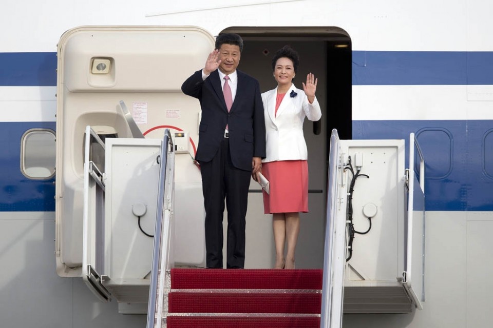 | Vợ chồng Chủ tịch Trung Quốc Tập Cần Bình đặt chân tới căn cứ không quân Andrews tại Washington D.C. ngày 24/9. Đầm đỏ kết hợp với vest trắng giúp trang phục của phu nhân ông Tập thanh lịch và trang trọng. Ảnh: Xinhua |