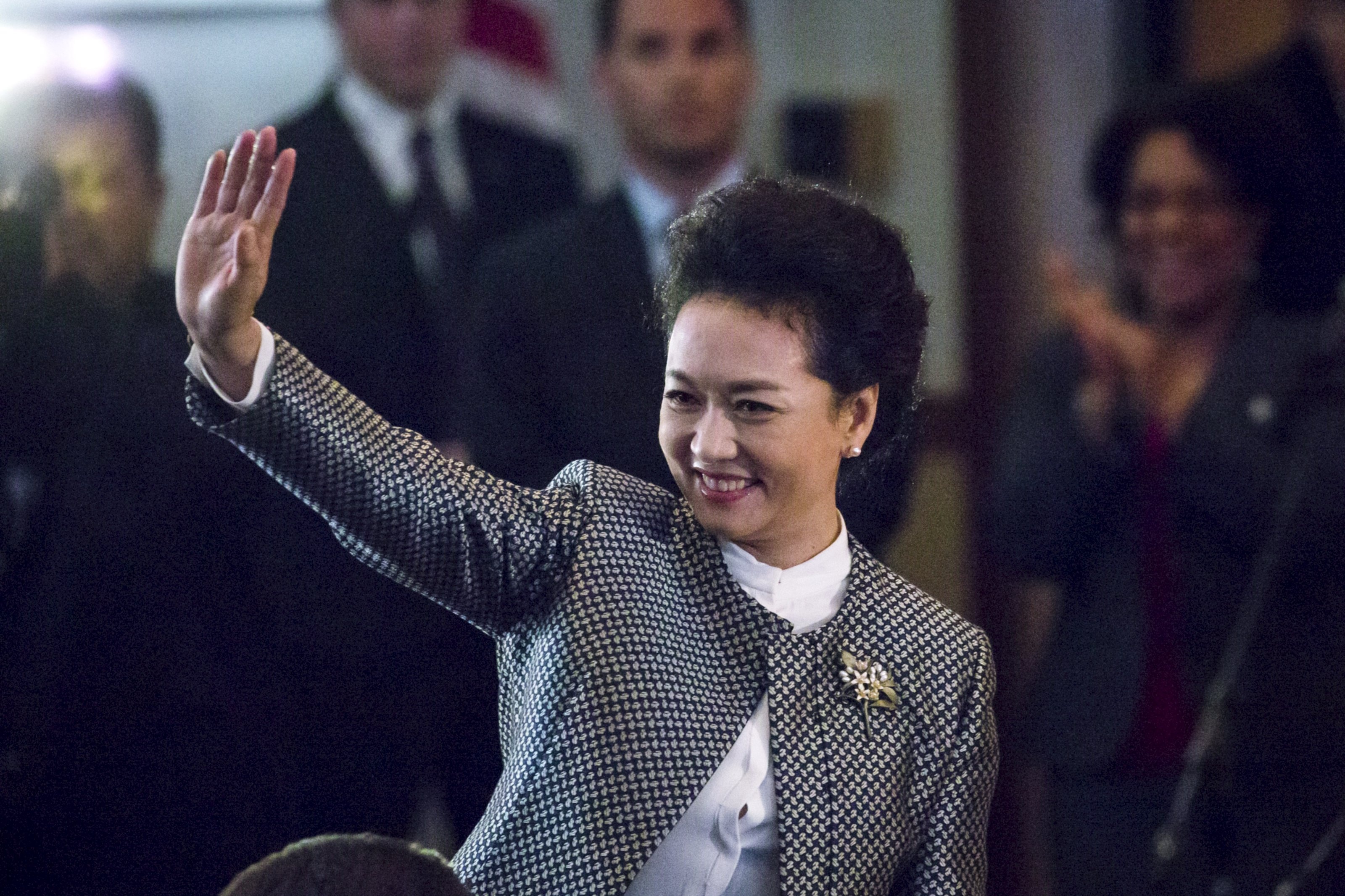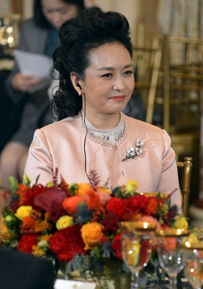 | Phu nhân chủ tịch Trung Quốc tại tiệc trưa ở Washington ngày 25/9. Bà Bành Lệ Viện hiện là chủ tịch Học viện nghệ thuật quân đội. Bà trở thành chiến sĩ văn công từ năm 1980, sau đó theo học tại Nhạc viện quốc gia và có bằng thạc sĩ năm 1990. Ảnh: Reuters |