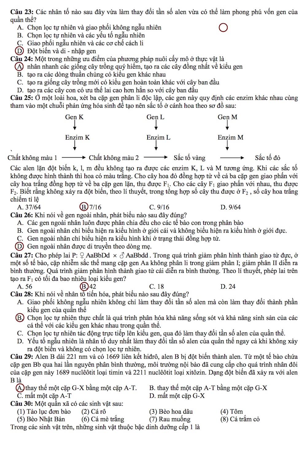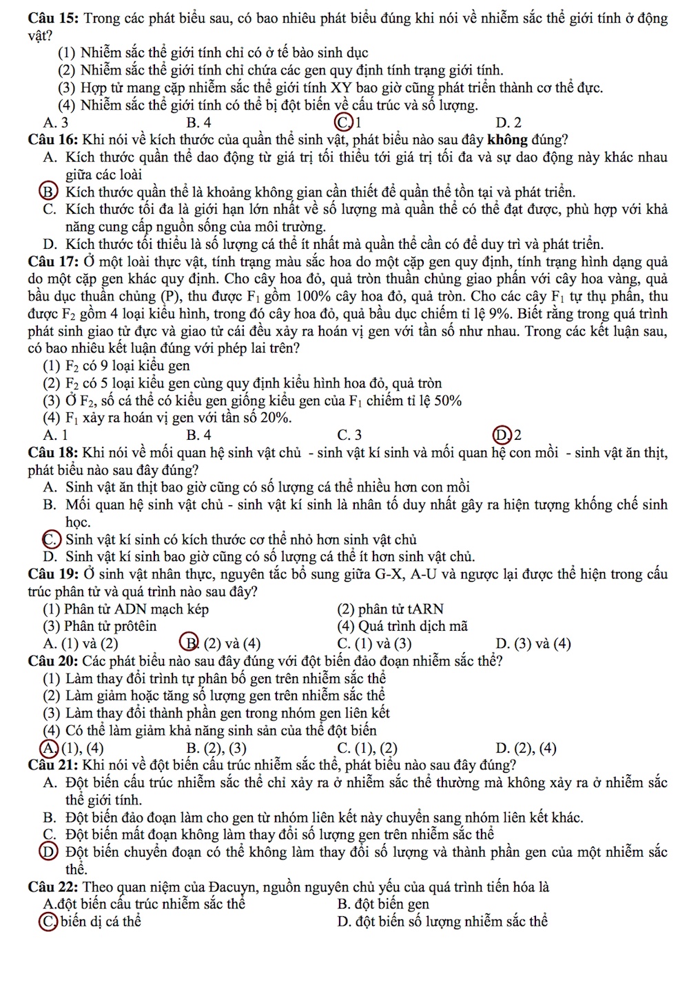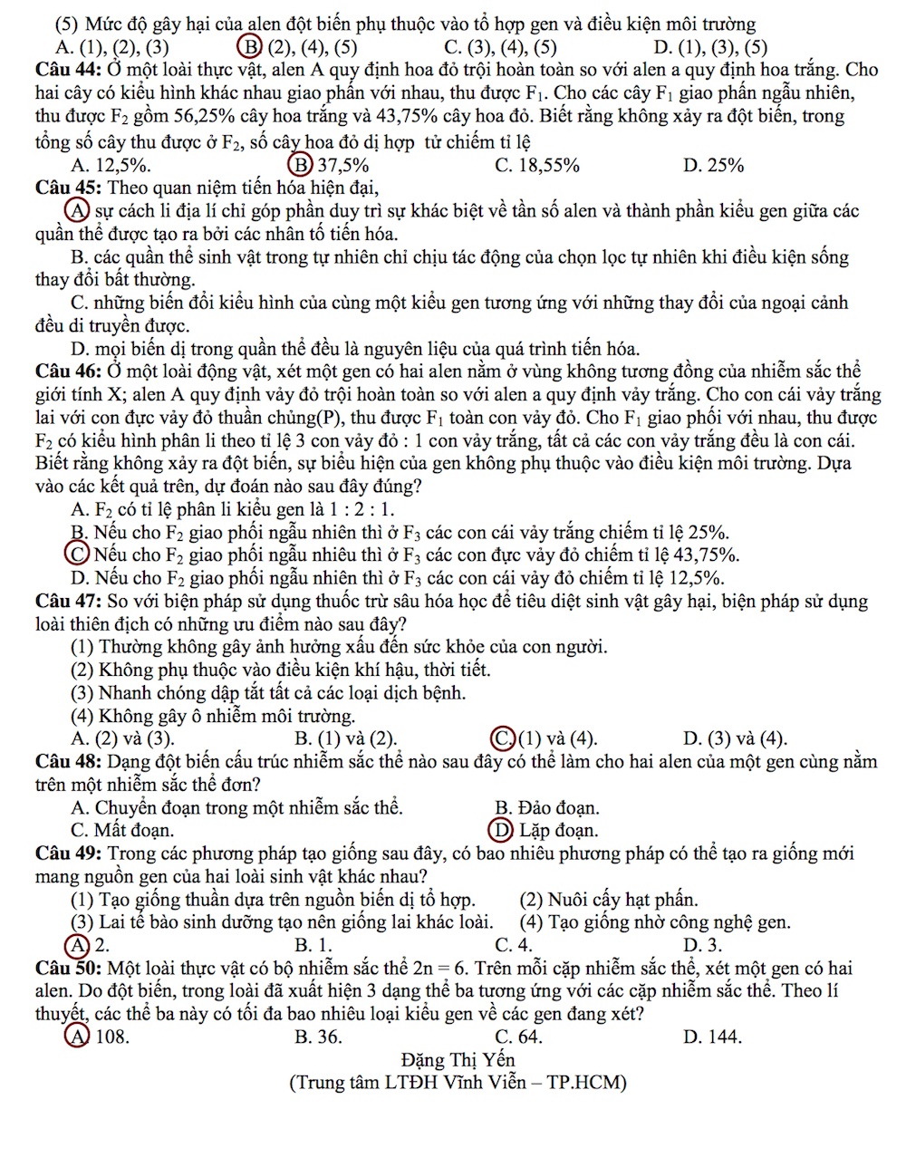 Gợi ý đáp án môn Sinh học (mã đề 426) do cô Đặng Thị Yến (Trung tâm LTĐH Vĩnh Viễn, TP.HCM) thực hiện: