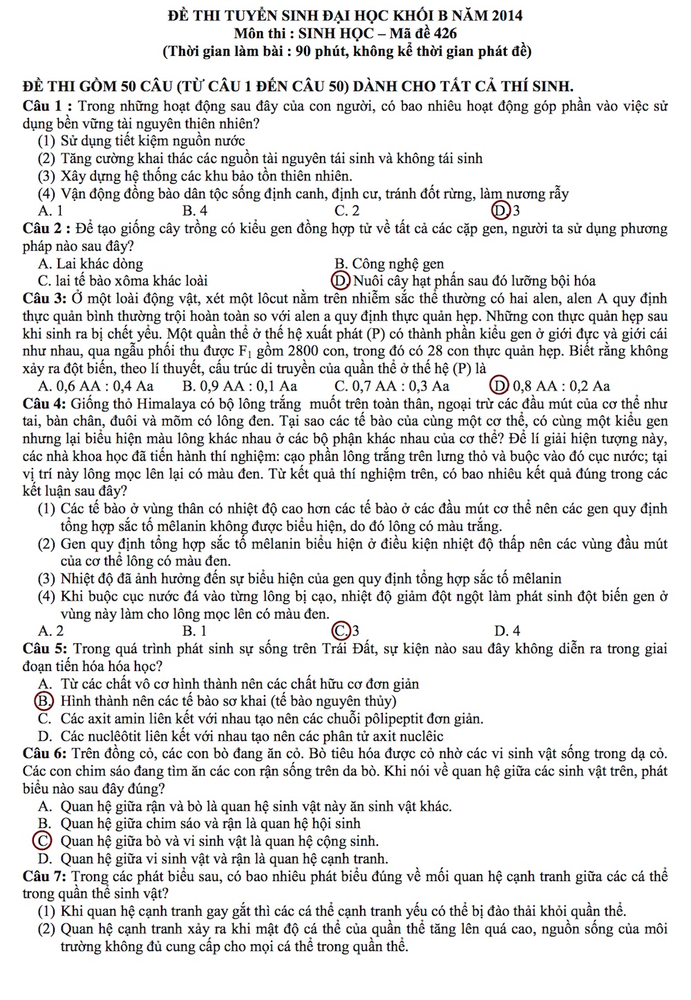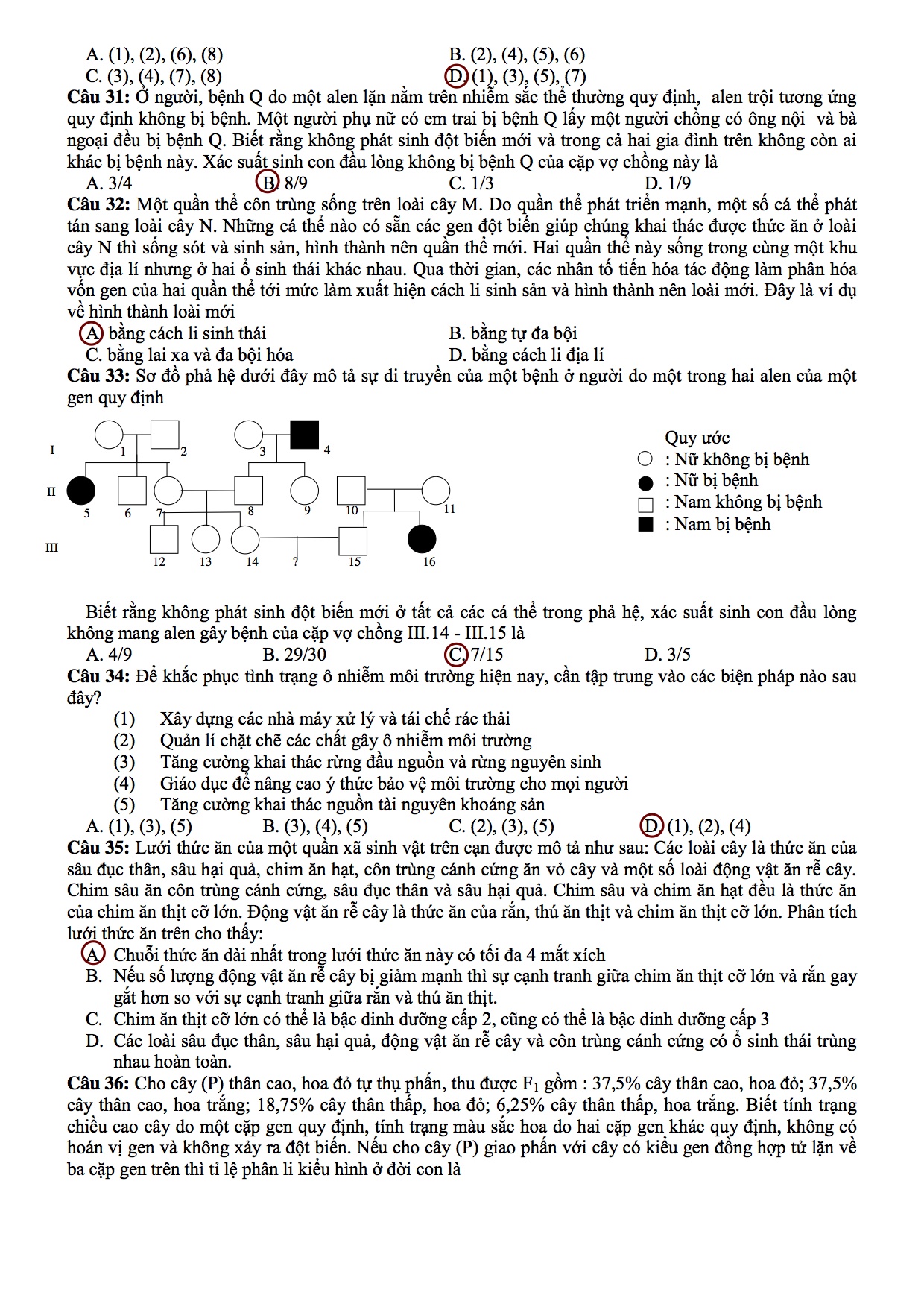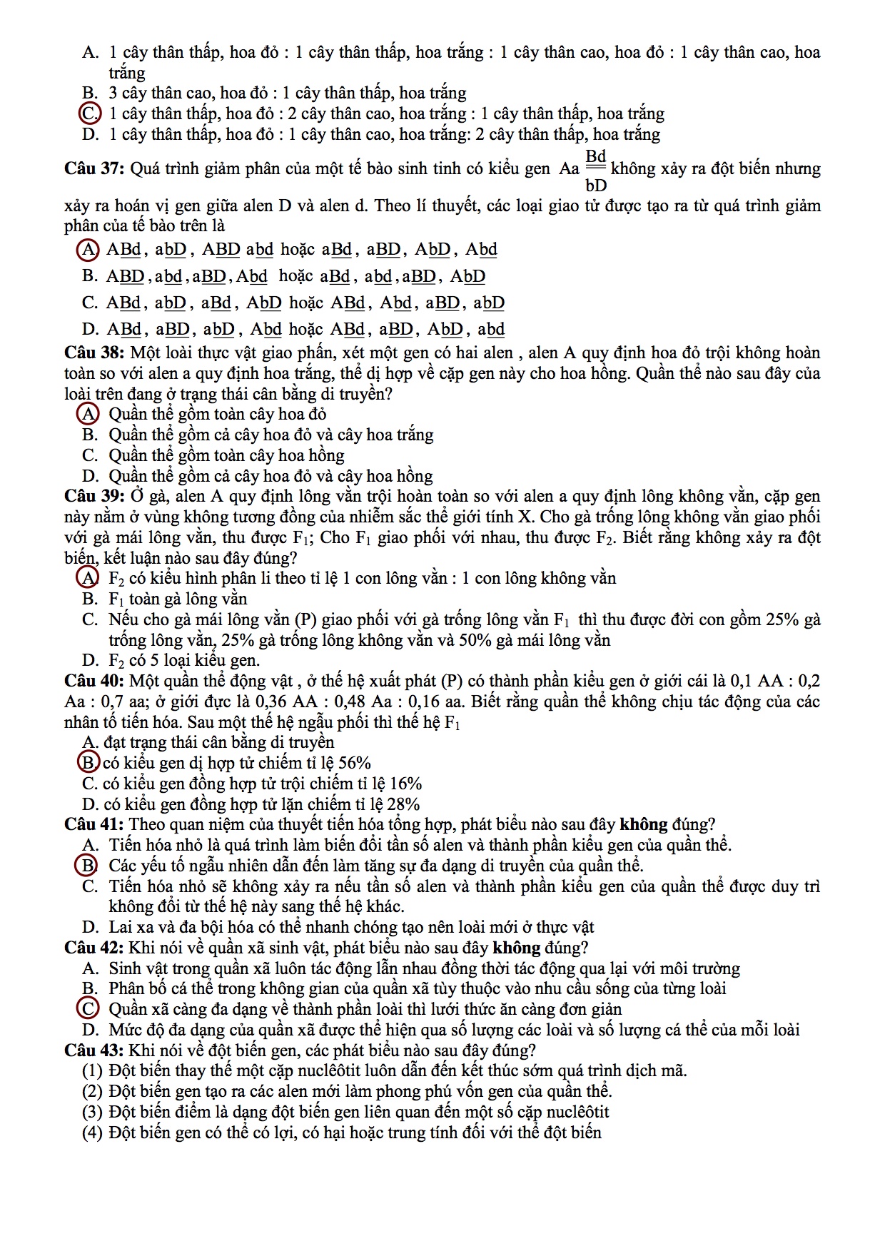 Gợi ý đáp án môn Sinh học (mã đề 426) do cô Đặng Thị Yến (Trung tâm LTĐH Vĩnh Viễn, TP.HCM) thực hiện: