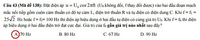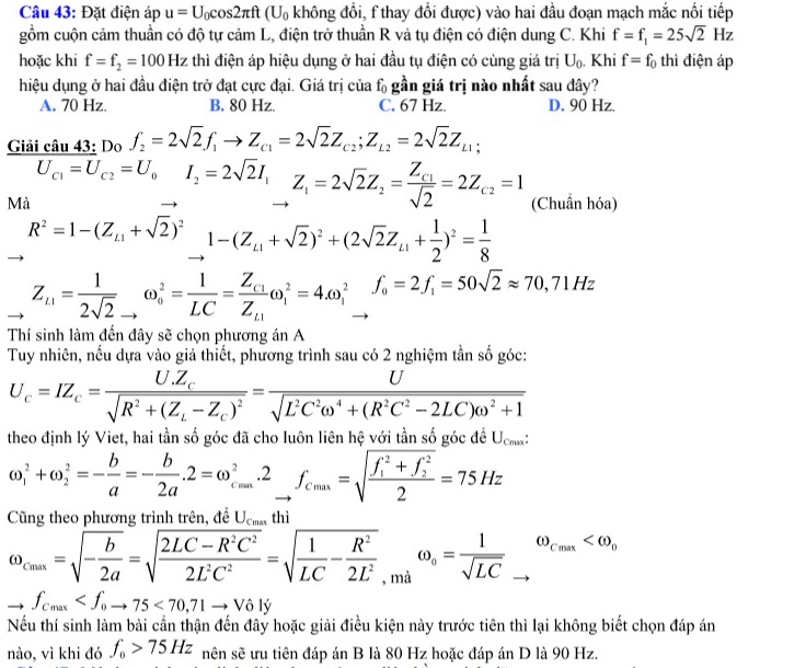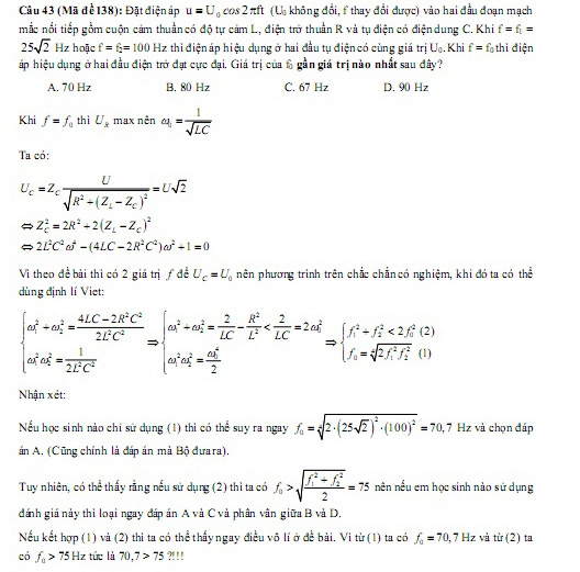 Một số ý kiến trên diễn đàn cho rằng: Theo đáp án chính thức của Bộ GD&ĐT, kết quả cần tìm là 70 Hz (đáp án A - phần khoanh đỏ phía trên). Tuy nhiên, khi đối chiếu với điều kiện f1, f2 thì kết quả này không thỏa mãn yêu cầu đề bài.