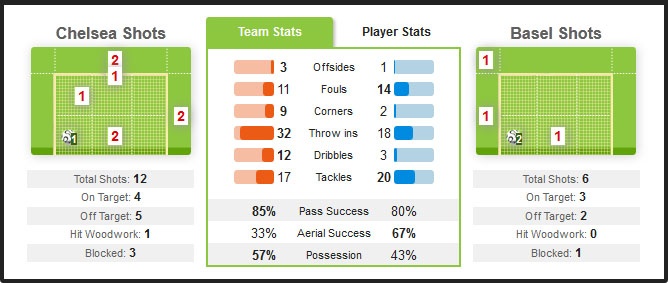 Tấn công nhiều nhưng không tận dụng thành công, Chelsea đã phải trả giá khi nhận bàn thua ở phút 71. Từ vị trí trong vòng 16m50, Salah thực hiện cú cứa lòng hoàn hảo khiến thủ môn Petr Cech không có cơ hội cản phá. Sau khi để Basel gỡ hòa 1-1, HLV Mourinho quyết định tăng cường khả năng tấn công cho Chelsea bằng việc đưa Obi Mikel, Demba Ba vào sân thay Van Ginkel và Lampard.