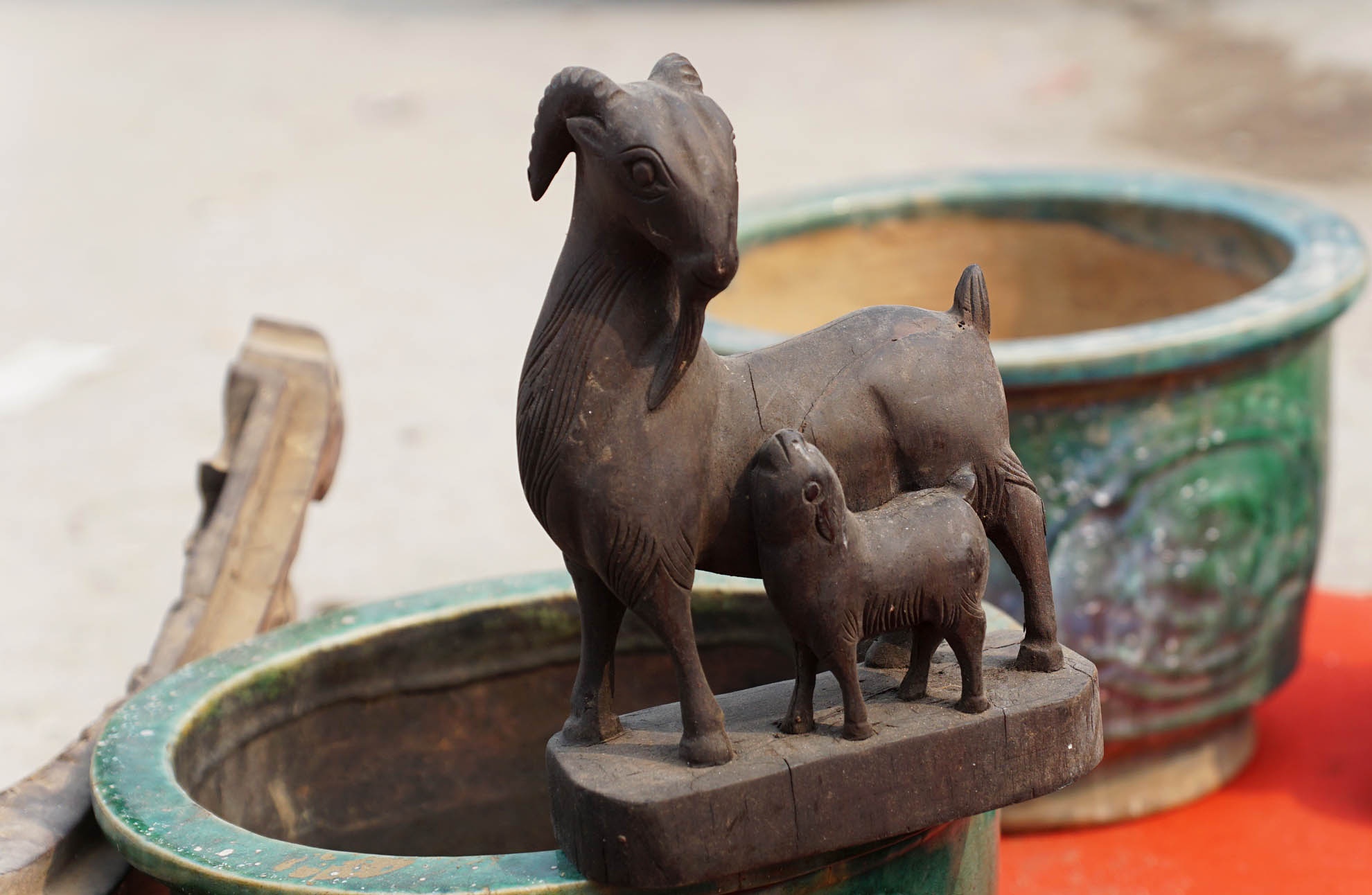 Đôi tượng dê kéo tiền vàng bằng gỗ trắc trạm trổ tinh vi hàm ý mang lại tiền tài, phúc lộc trong năm mới được rao bán với giá 3,5 triệu đồng.