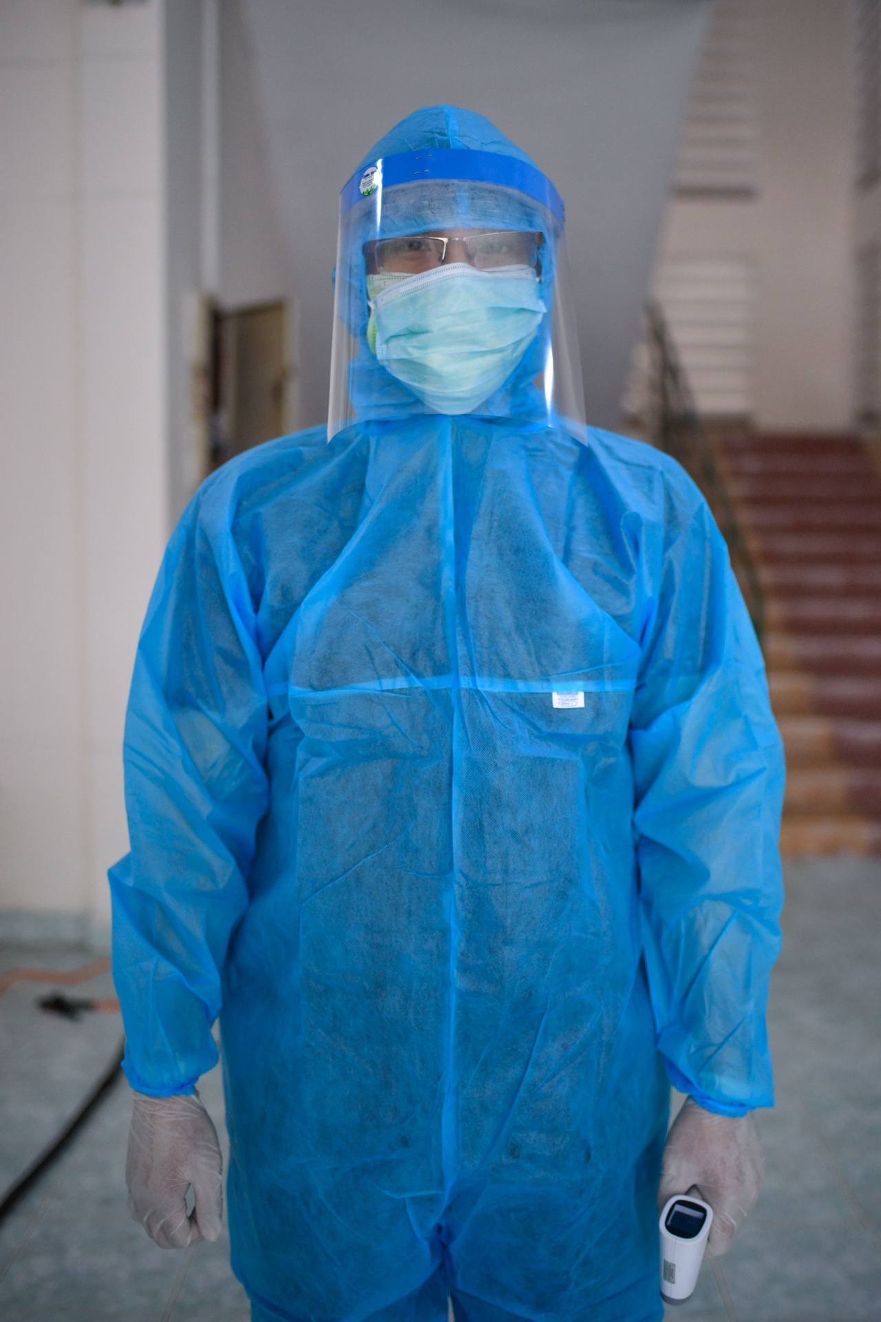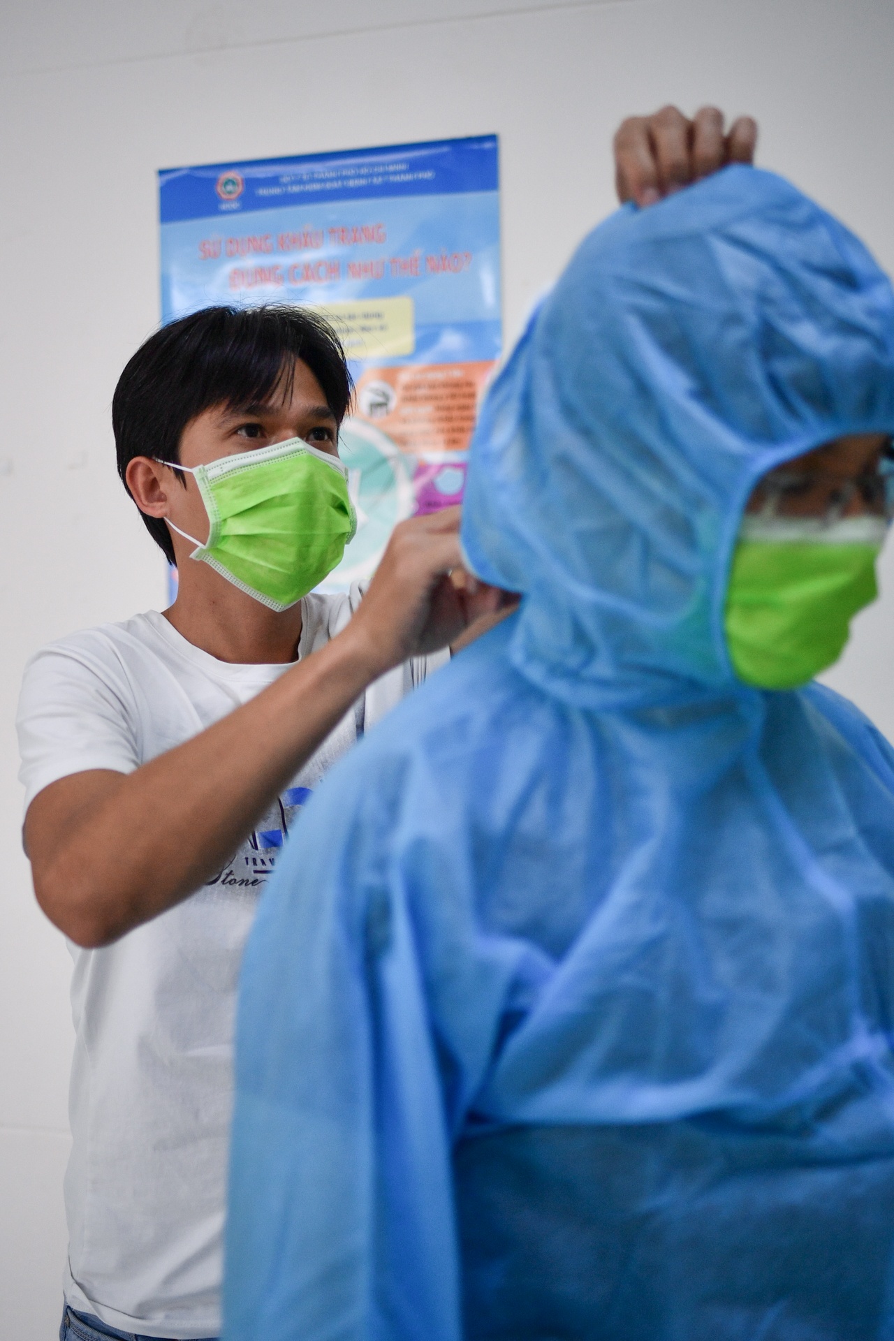| Gần 17h, tôi cùng điều dưỡng Tâm thay trang phục bảo hộ, vào khu cách ly đo nhiệt độ cho mọi người. |