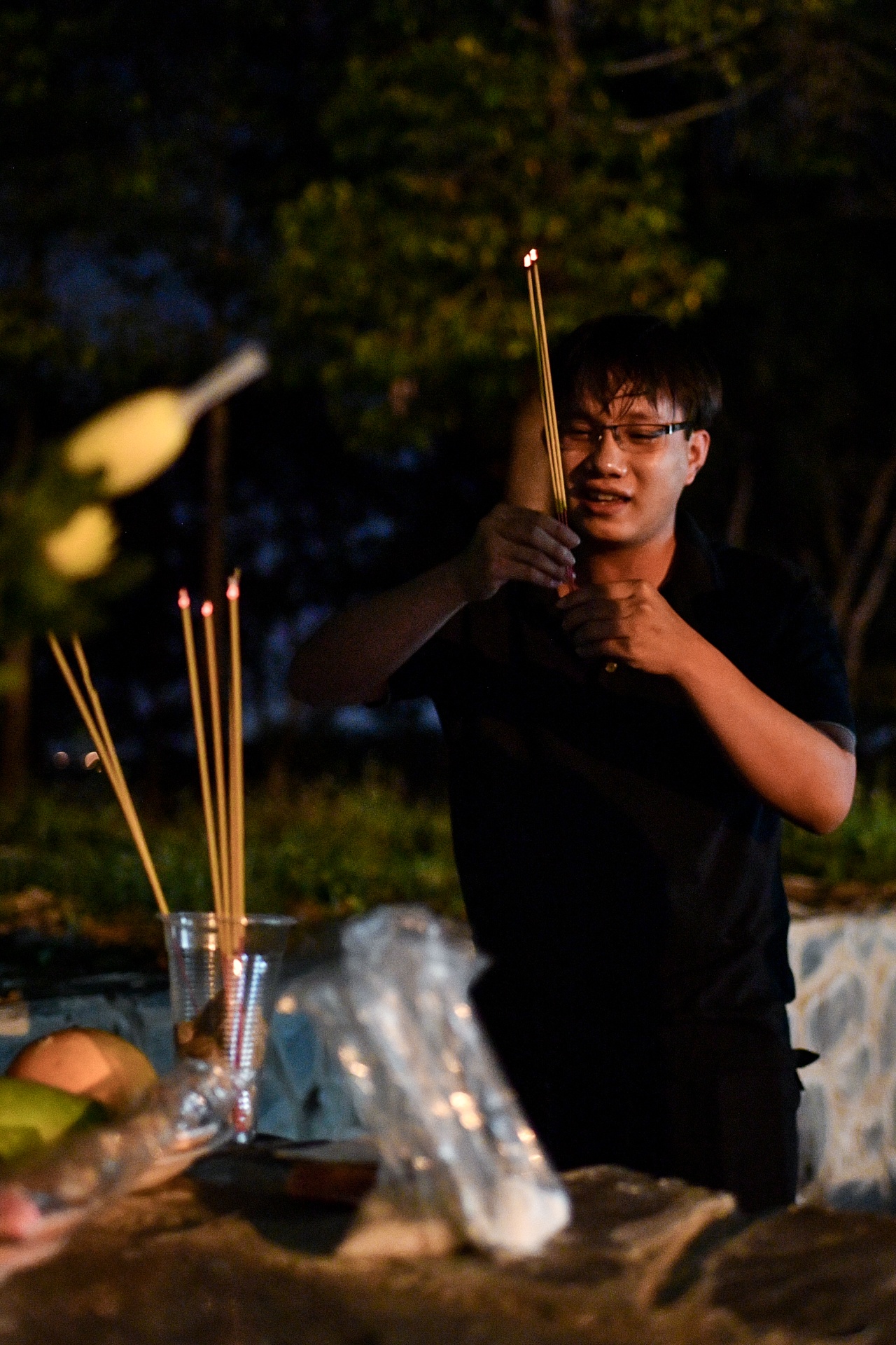 | Thời khắc giao thừa cũng đã điểm, tôi ra thắp nhang tại mâm cúng đơn sơ trước sảnh, một thủ tục phải có của ngày Tết. |