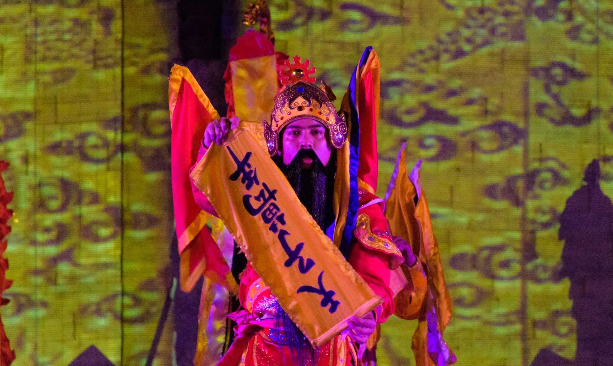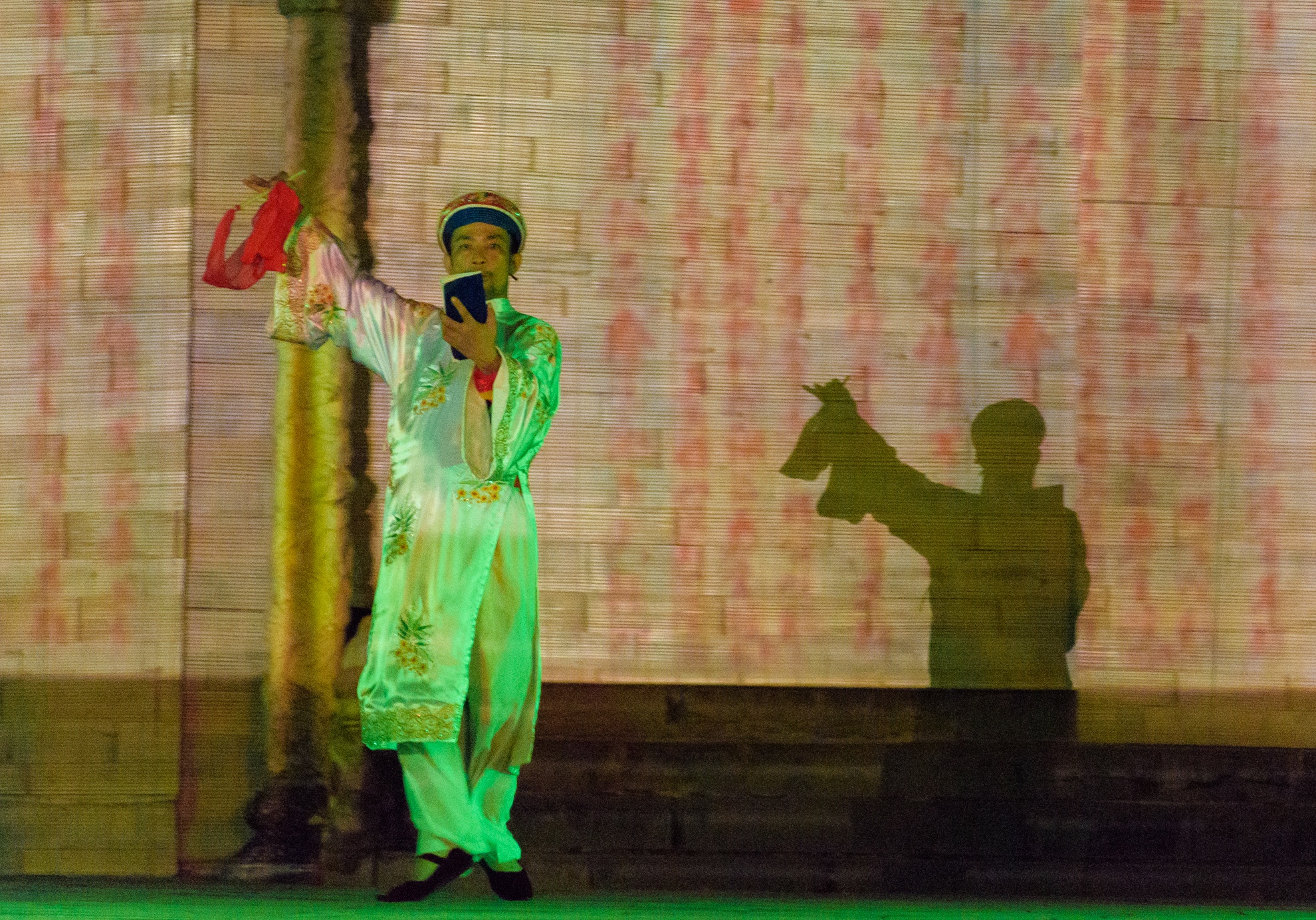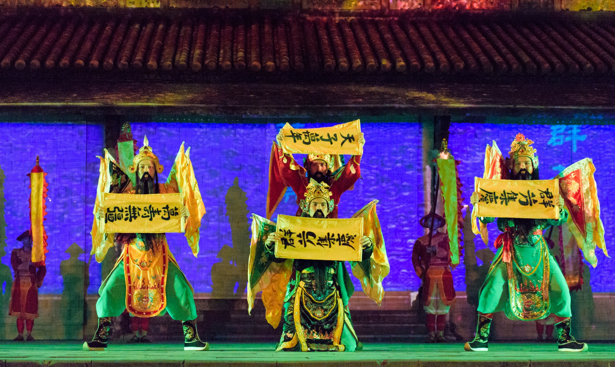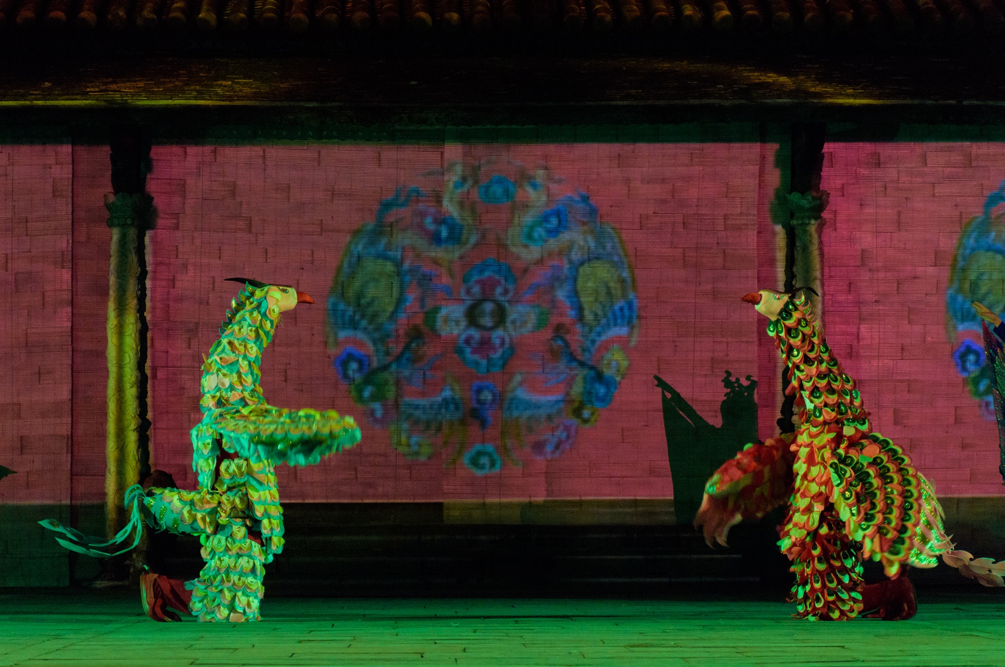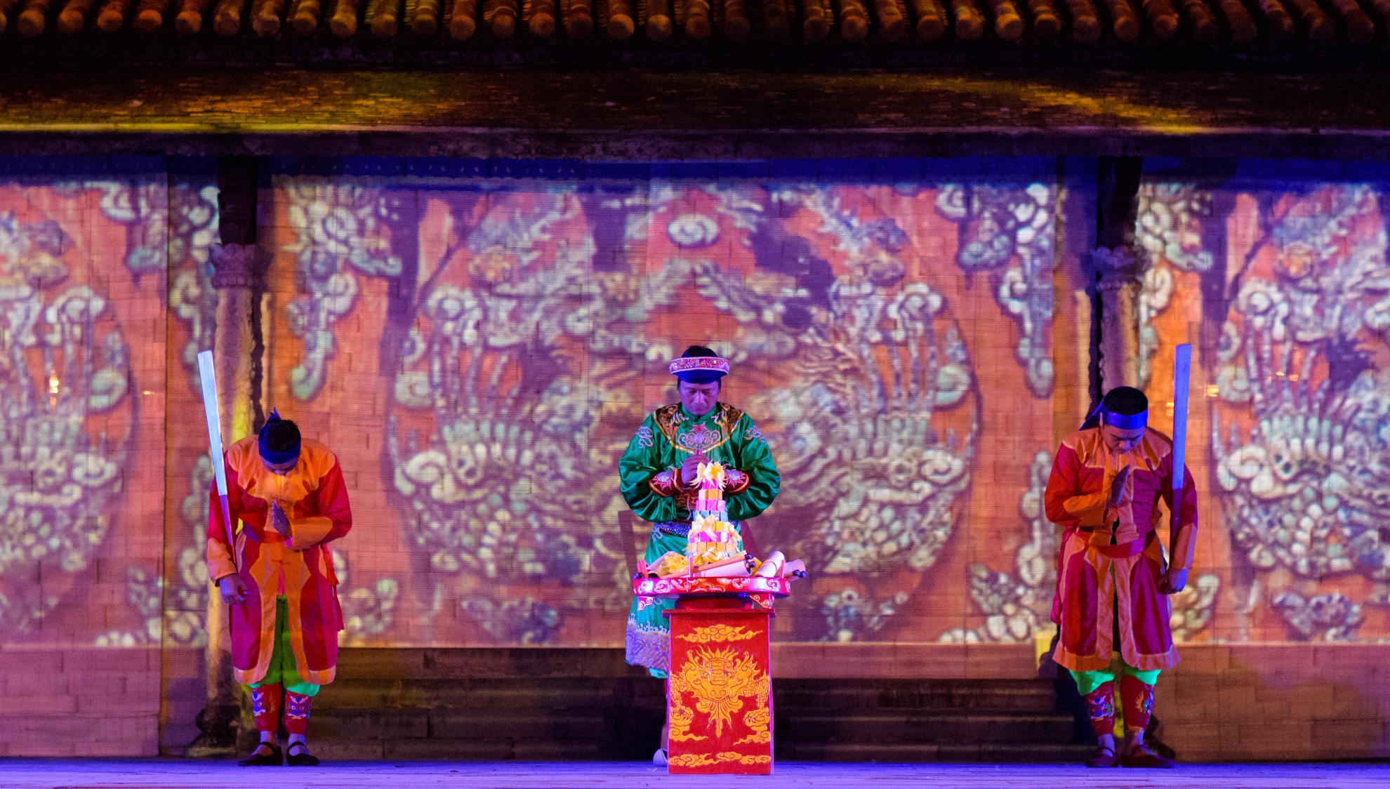 Hàng trăm diễn viên chuyên nghiệp lẫn không chuyên được huy động để sắm vai từ anh lính lệ đến ông hoàng bà chúa. Những cây cổ thụ, hoa viên, ngự viên trong hoàng thành như sống lại bằng hệ thống chiếu sáng vừa phải. |