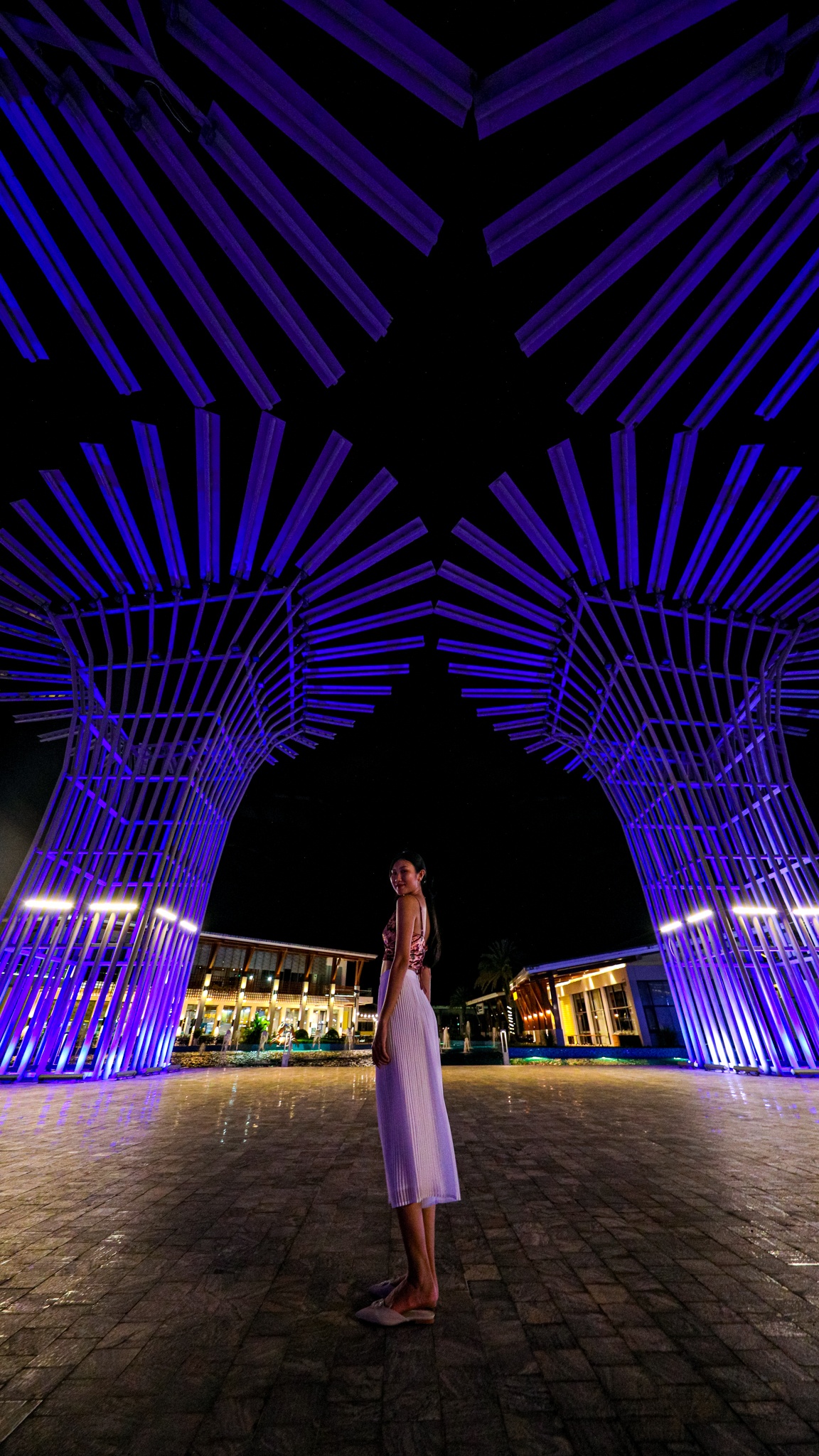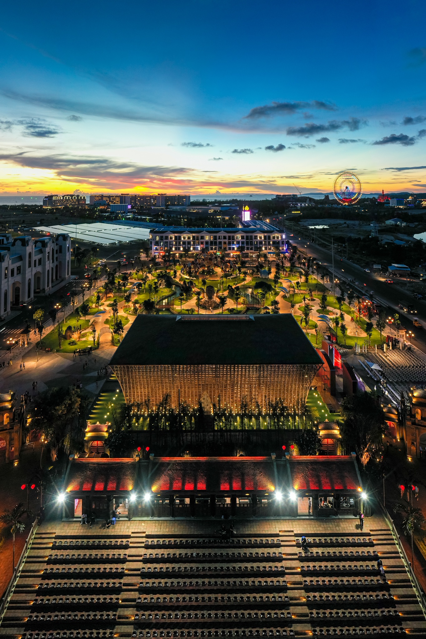 | Từ bảo tàng gấu bông, tôi đi bộ khoảng 5 phút là đến công trình Huyền thoại tre. Do tham quan buổi tối nên tôi chỉ ngắm khối kiến trúc độ sộ cao gần 15 m từ xa. |