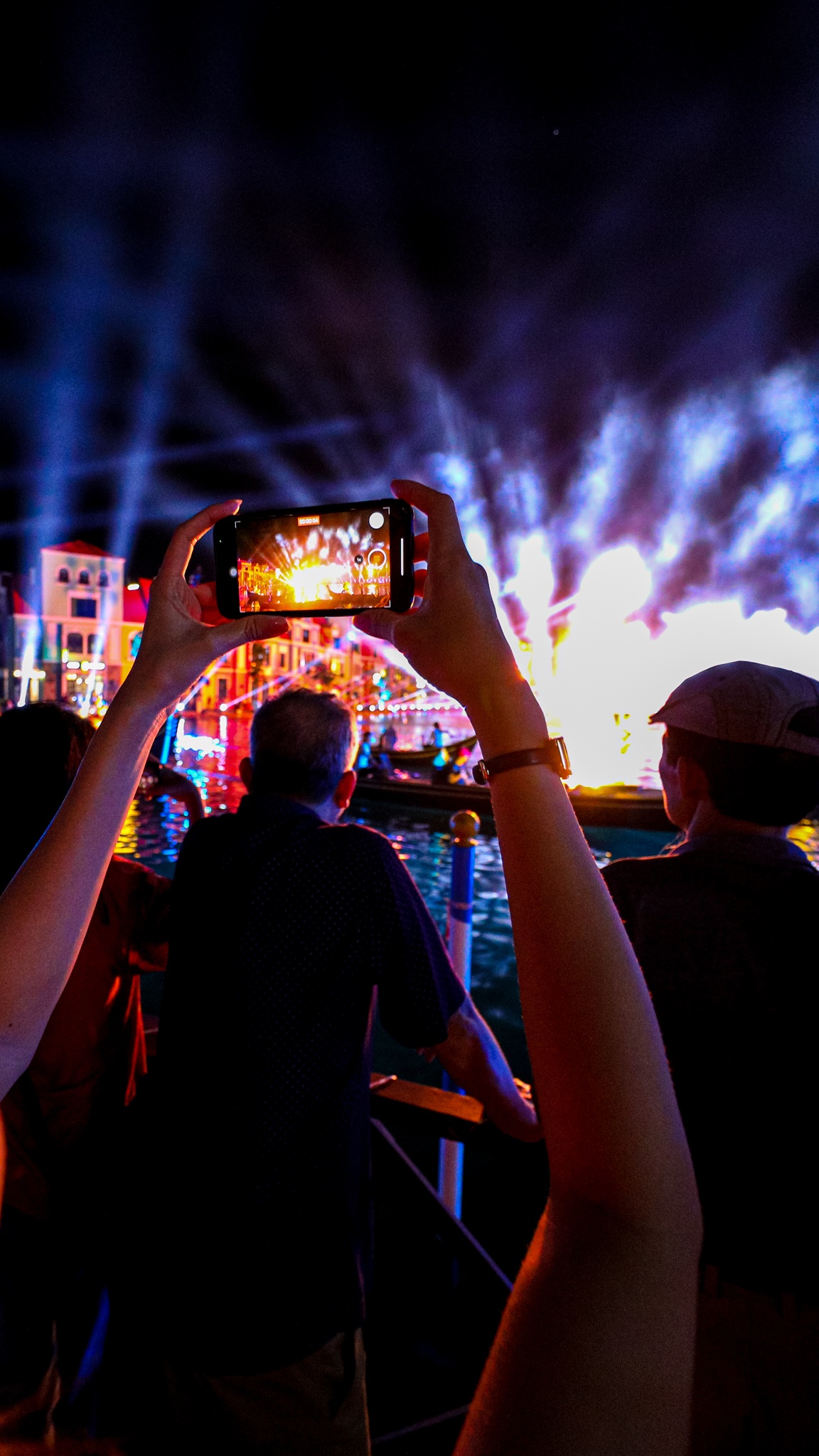 | Bây giờ là 21h. Tôi đến vừa kịp lúc show thực cảnh đa phương tiện “Sắc màu Venice” diễn ra. Đây là show diễn mở cửa tự do, thu hút rất đông khán giả. Tôi nhanh chóng chọn một vị trí đẹp để theo dõi màn trình diễn này. |