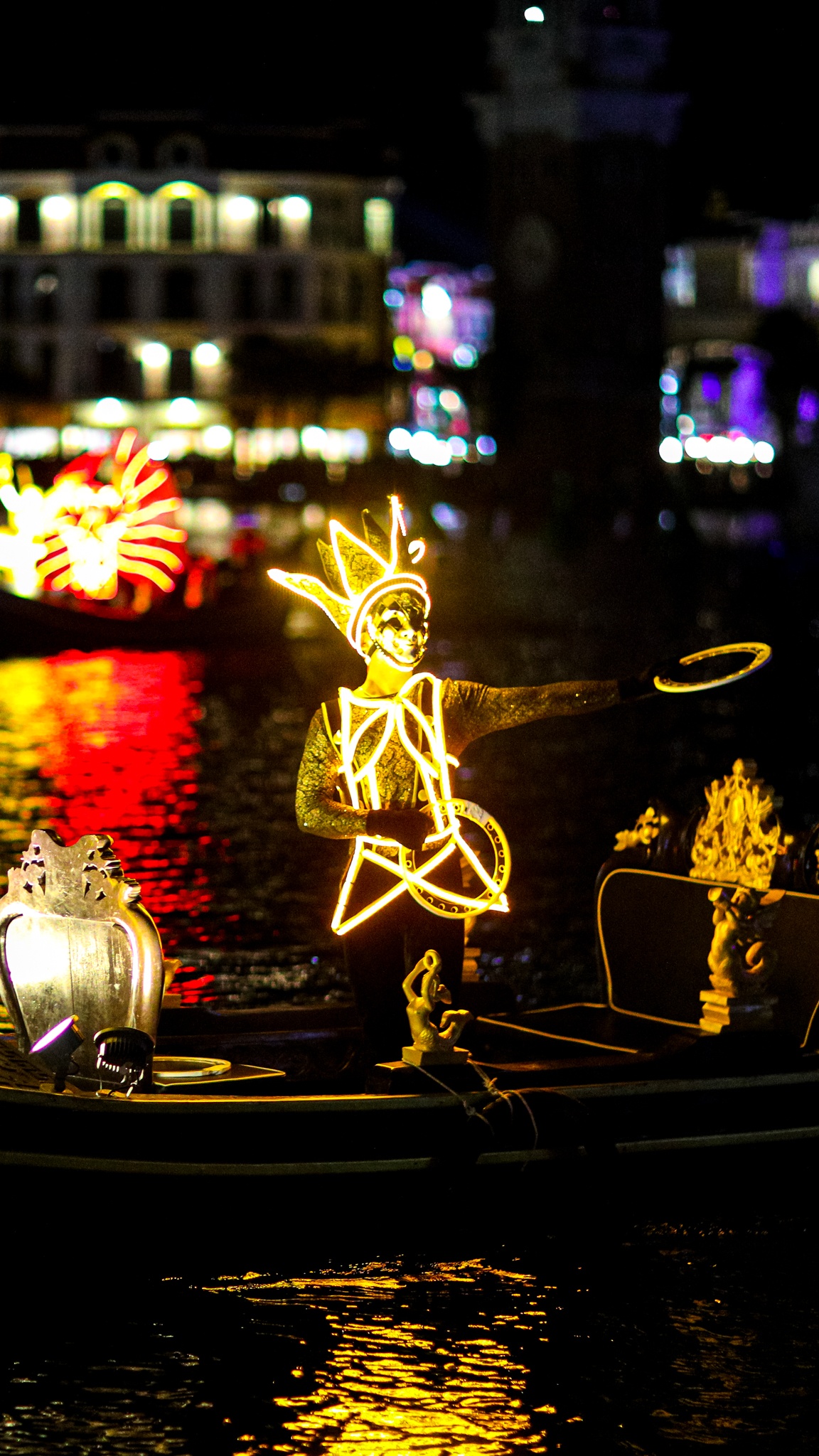 | Những con thuyền gondola chở theo các vũ công nối đuôi nhau tiến vào trung tâm hồ, kết hợp hiệu ứng ánh sáng tạo nên khung cảnh ấn tượng. |
