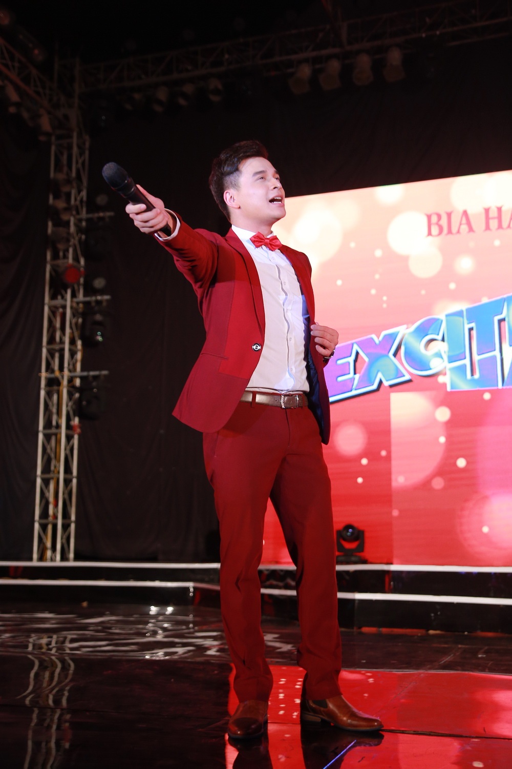 | MC Danh Tùng có những màn ngẫu hứng làm khán giả thích thú trong bữa tiệc âm nhạc Exciting Habeco. |