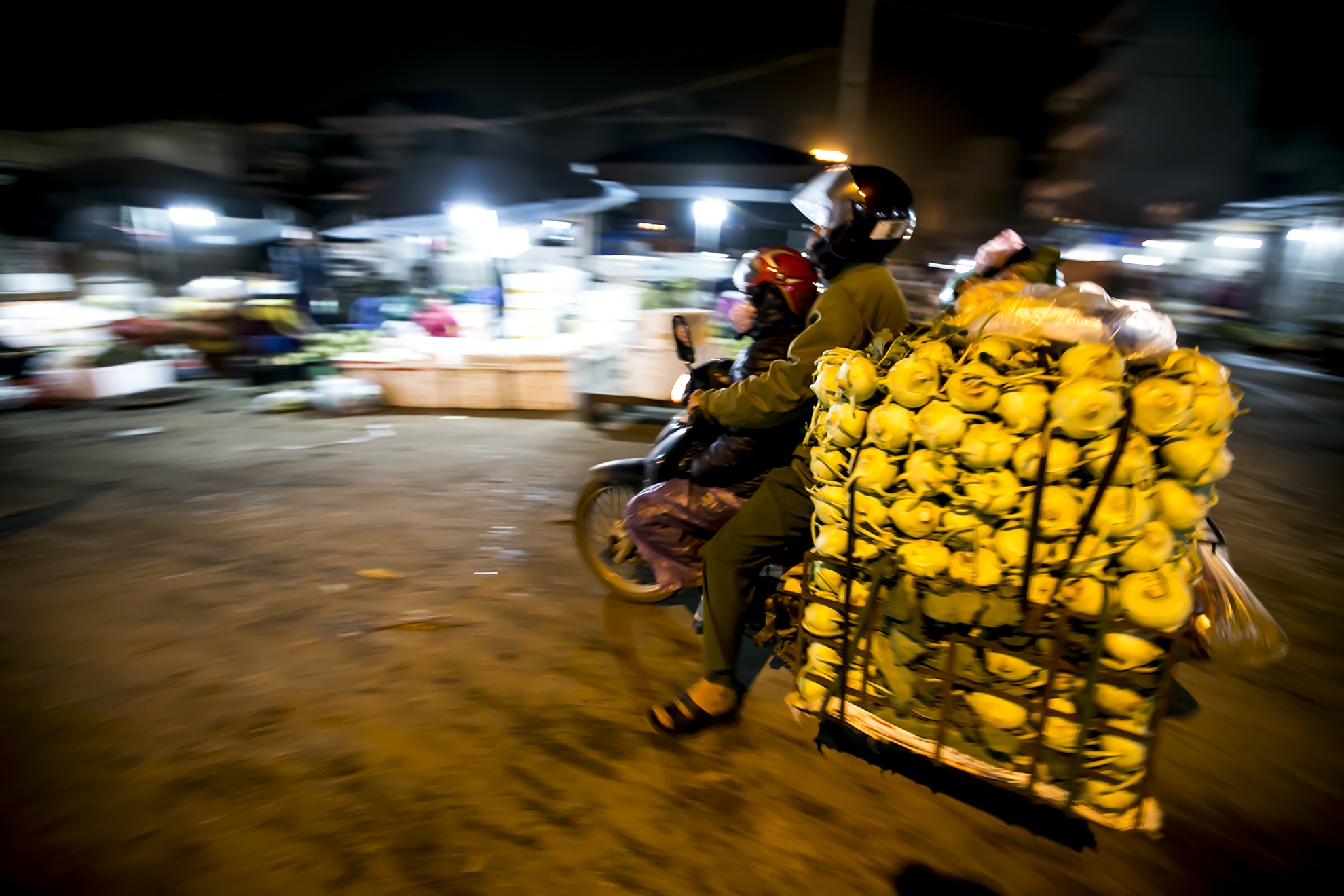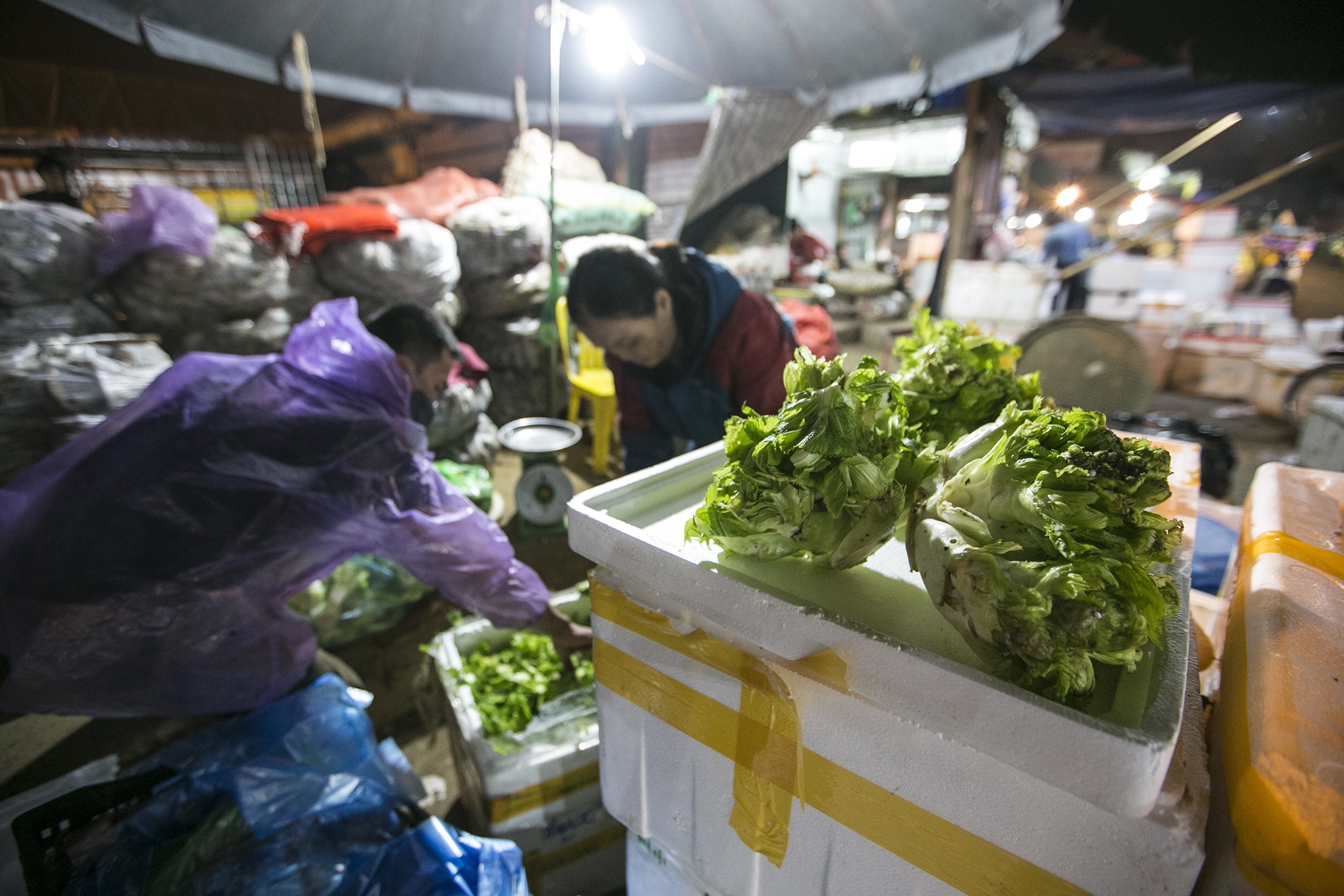 Càng về đêm, khu chợ càng thêm náo nhiệt và đông đúc. Các tiểu thương phải bán thật nhanh trước 6h sáng để giúp cho tài xế xe tải ra khỏi thành phố trước giờ cấm. |