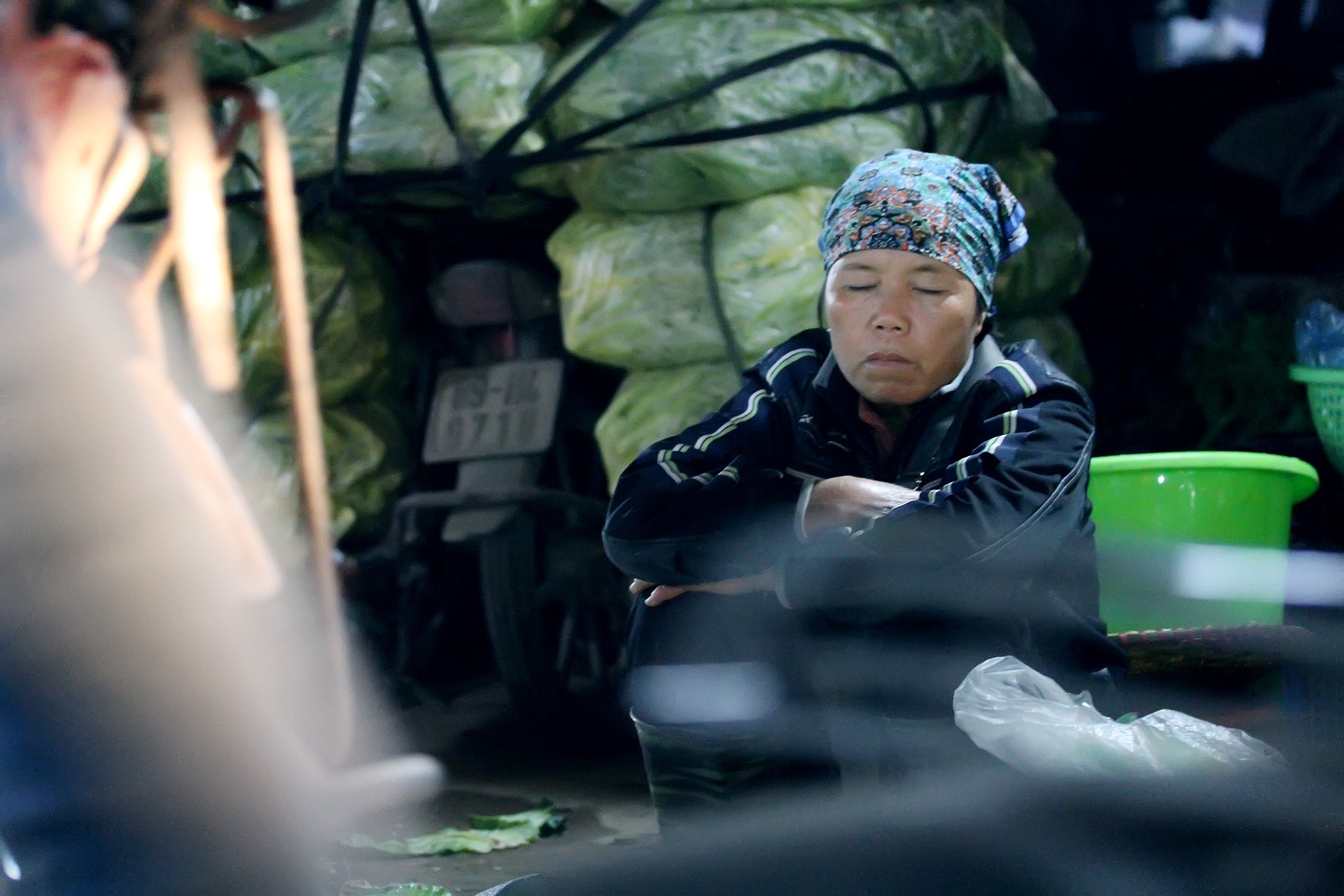 Các tiểu thương ở đây phần lớn đã làm nghề nhiều năm và quen với nhịp sinh học hoạt động khi đêm về. Tuy nhiên, công việc mệt mỏi kéo dài, để đảm bảo sức khỏe nhiều người cũng cố một vài phút chợp mắt ngủ khi vãn khách. |