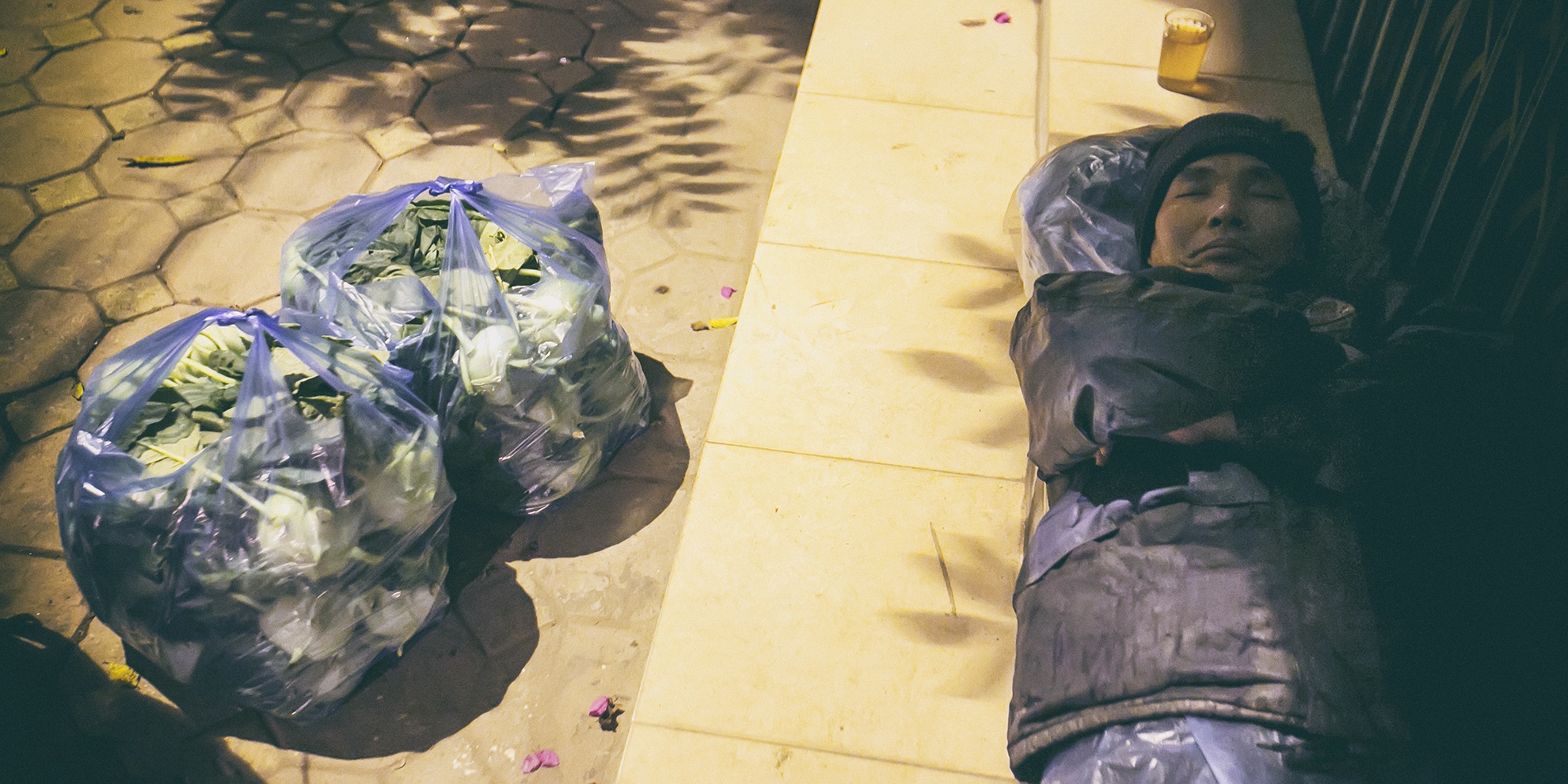 Hoặc có người ngủ ngay trên vỉa hè với một cốc trà nóng còn chưa uống kịp. |