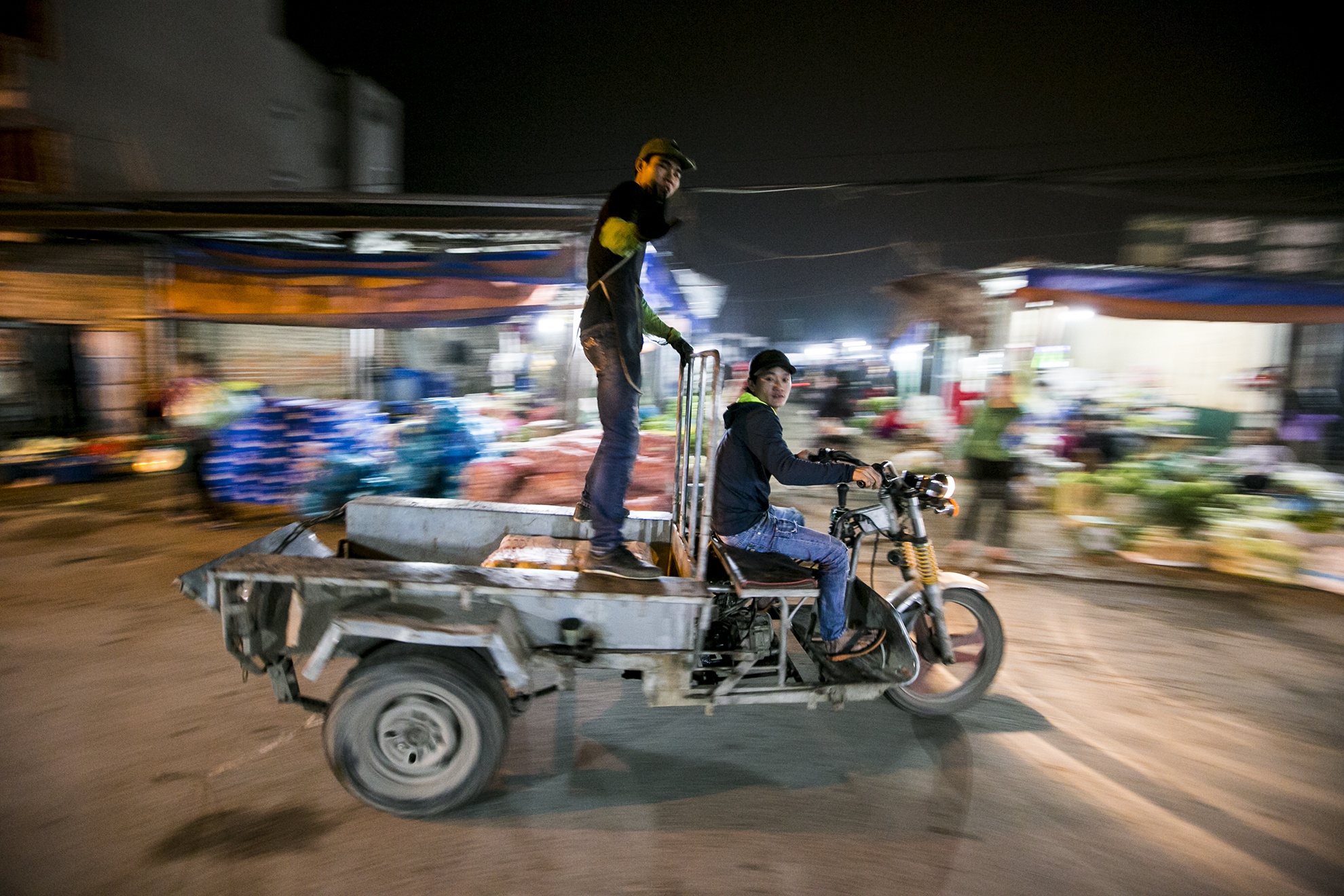 Về đêm, những chiếc xe chở hàng đều vội vã phóng nhanh không chỉ trên đường Văn Quán, mà còn ngay cả trong chợ đông đúc. |