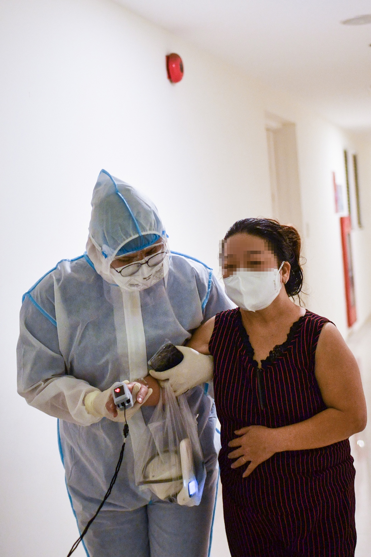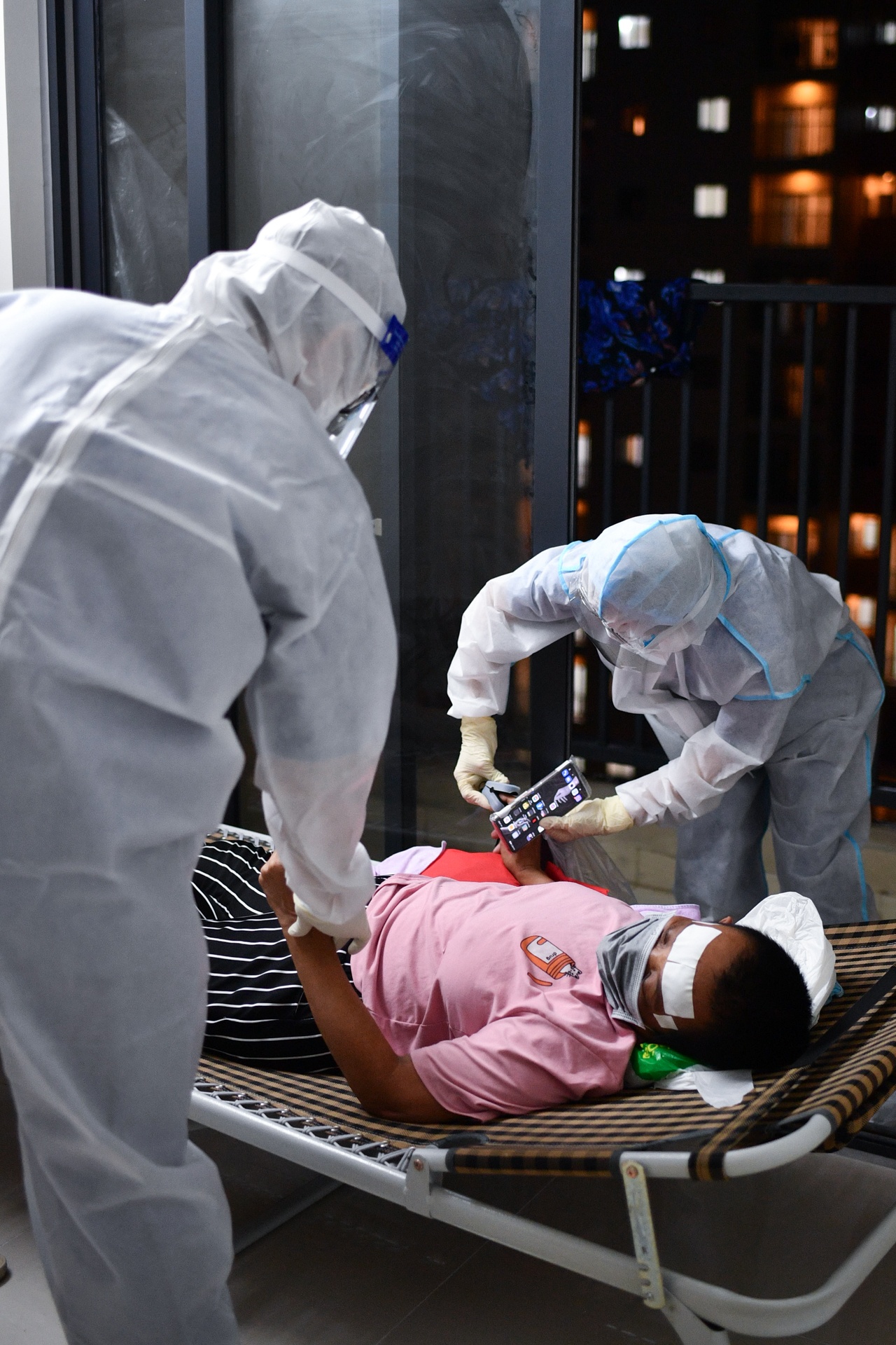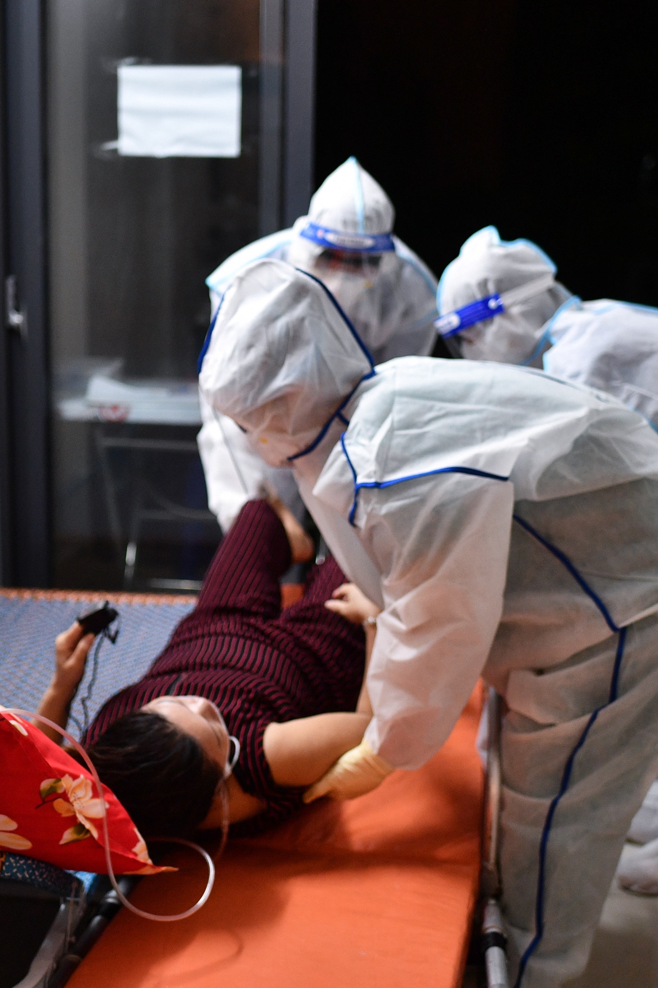 | Vừa nghỉ được 10 phút, chúng tôi tiếp tục lên tầng 3 để hỗ trợ một người phụ nữ bị sốt và khó thở. Những bệnh nhân cùng phòng cho biết bà đã gặp tình trạng này từ tối và càng lúc càng nghiêm trọng. |