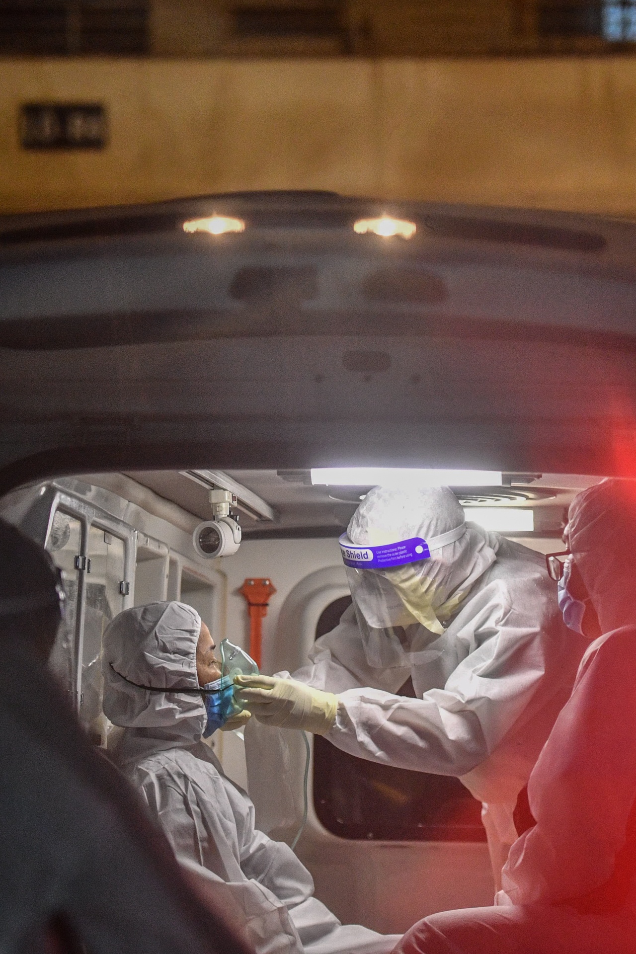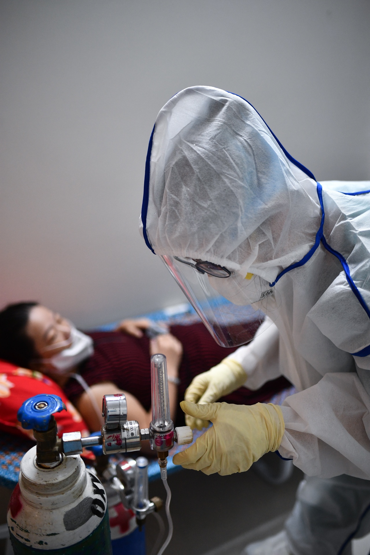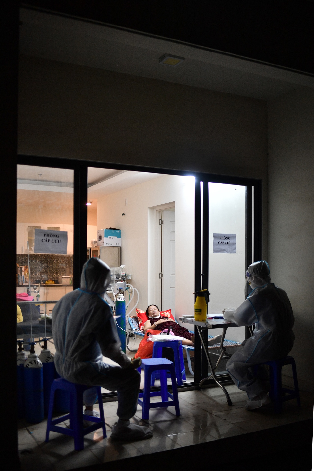 | Vừa nghỉ được 10 phút, chúng tôi tiếp tục lên tầng 3 để hỗ trợ một người phụ nữ bị sốt và khó thở. Những bệnh nhân cùng phòng cho biết bà đã gặp tình trạng này từ tối và càng lúc càng nghiêm trọng. |