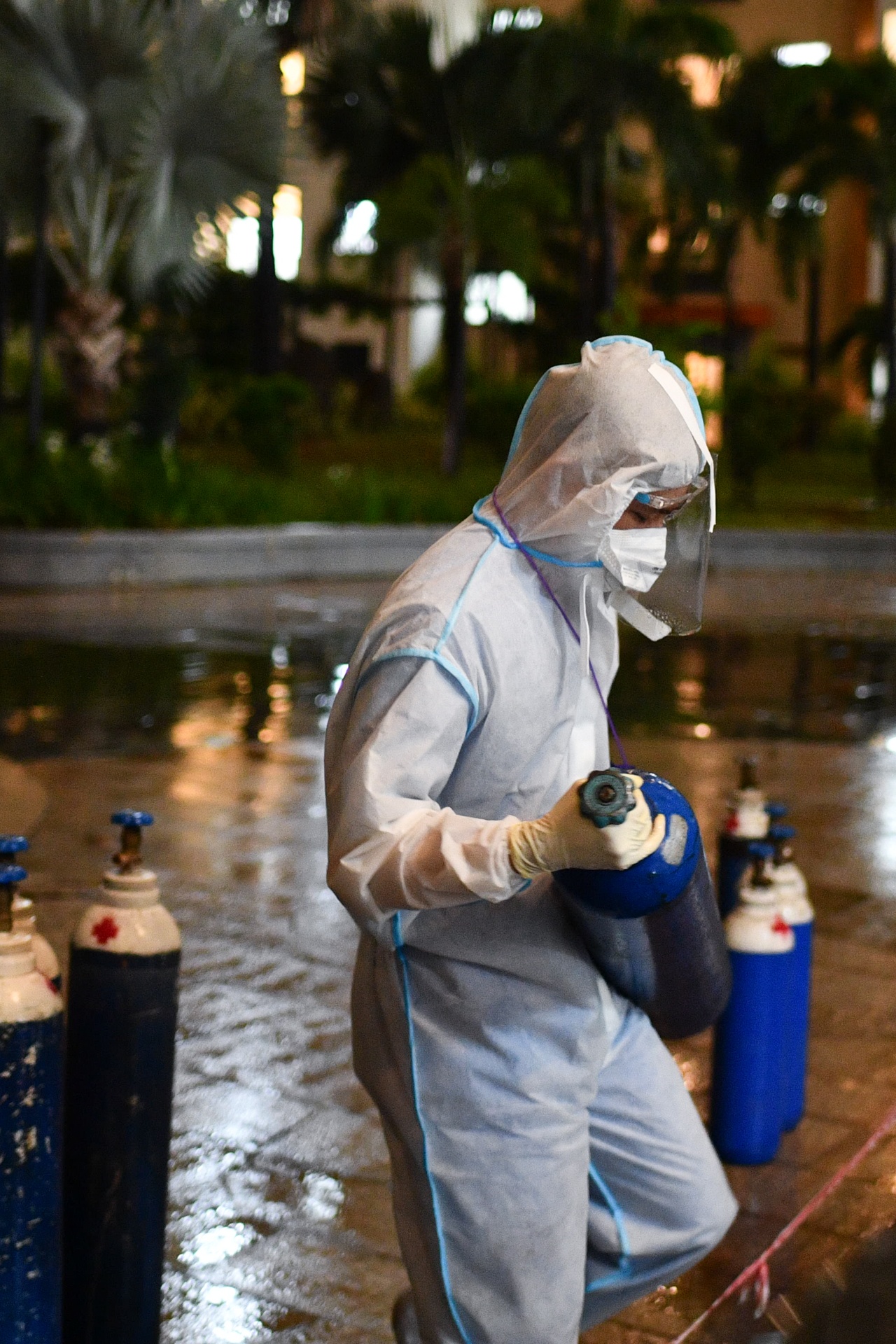 | Chúng tôi lấy thêm bình oxy, bóng ambu để chuẩn bị quá trình chuyển bệnh. Với nguy cơ diễn biến nặng, bệnh viện dã chiến vẫn phải chuẩn bị cơ bản đầy đủ thiết bị hỗ trợ cho việc cấp cứu bệnh nhân Covid-19. |